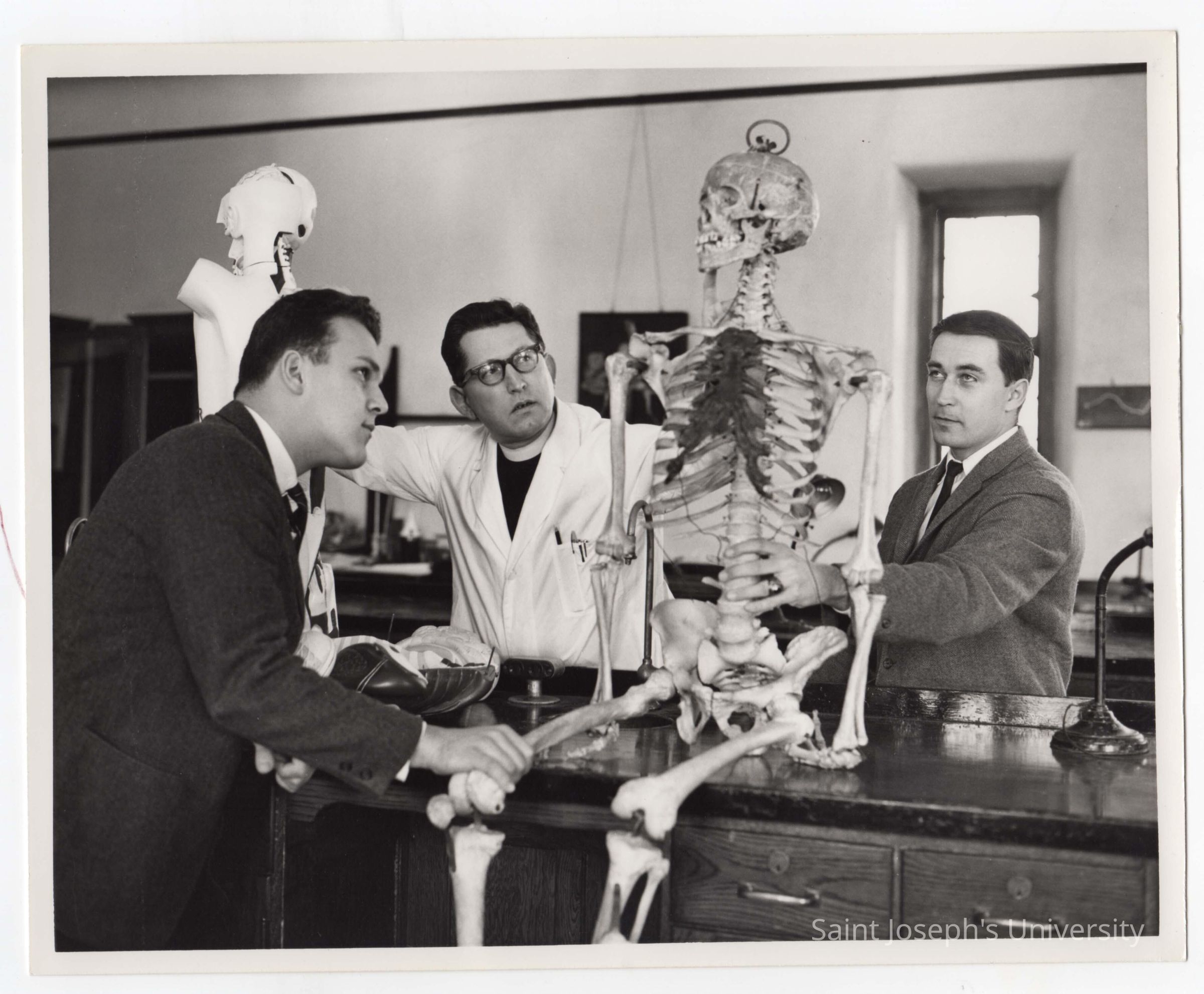 Biology professor Francis J. MacEntee, S.J., with two students in science laboratory looking at skeleton, April 1964.