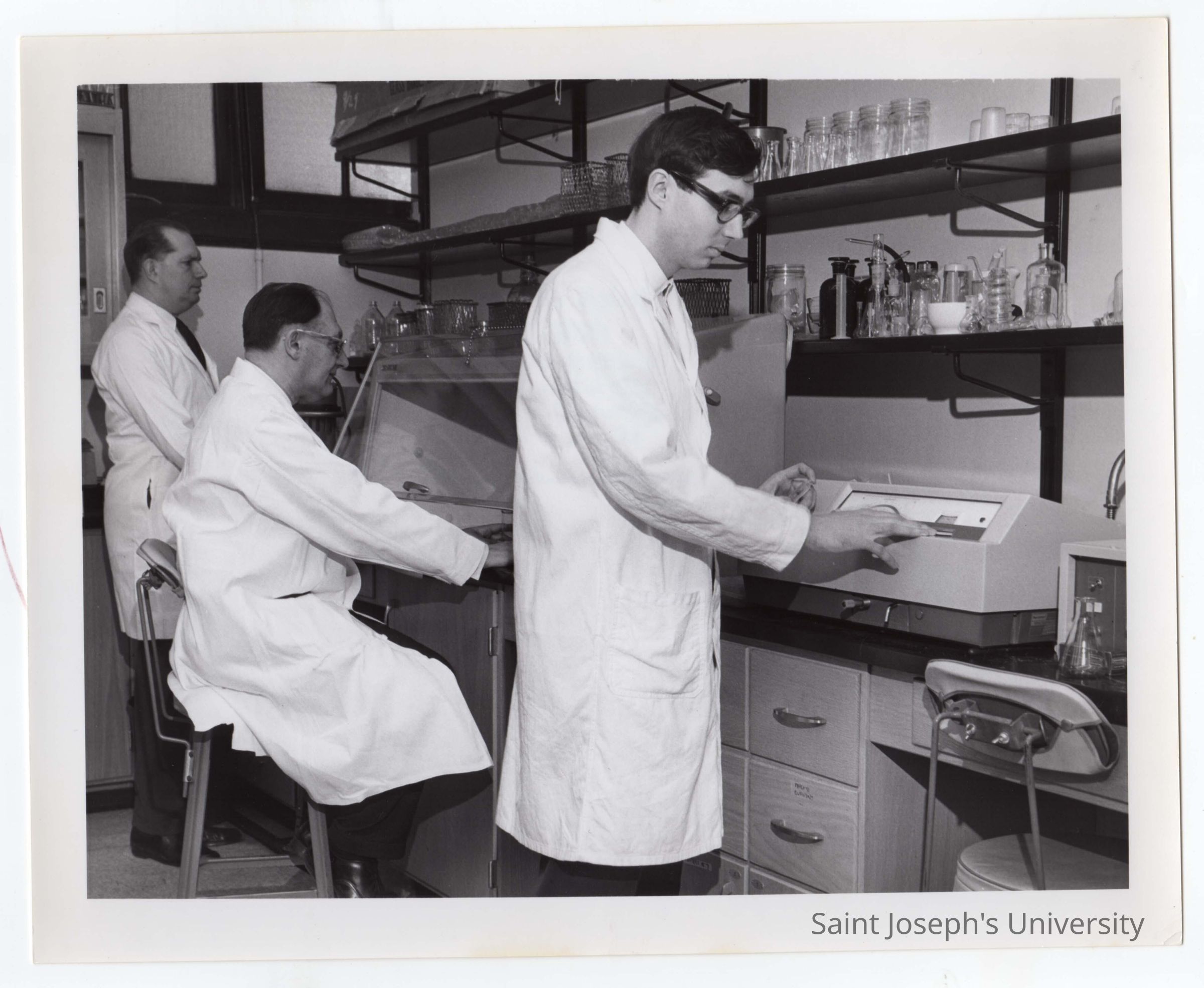 Biology professor, Louis Marks and colleagues using new equipment in science laboratory, March 1968.
