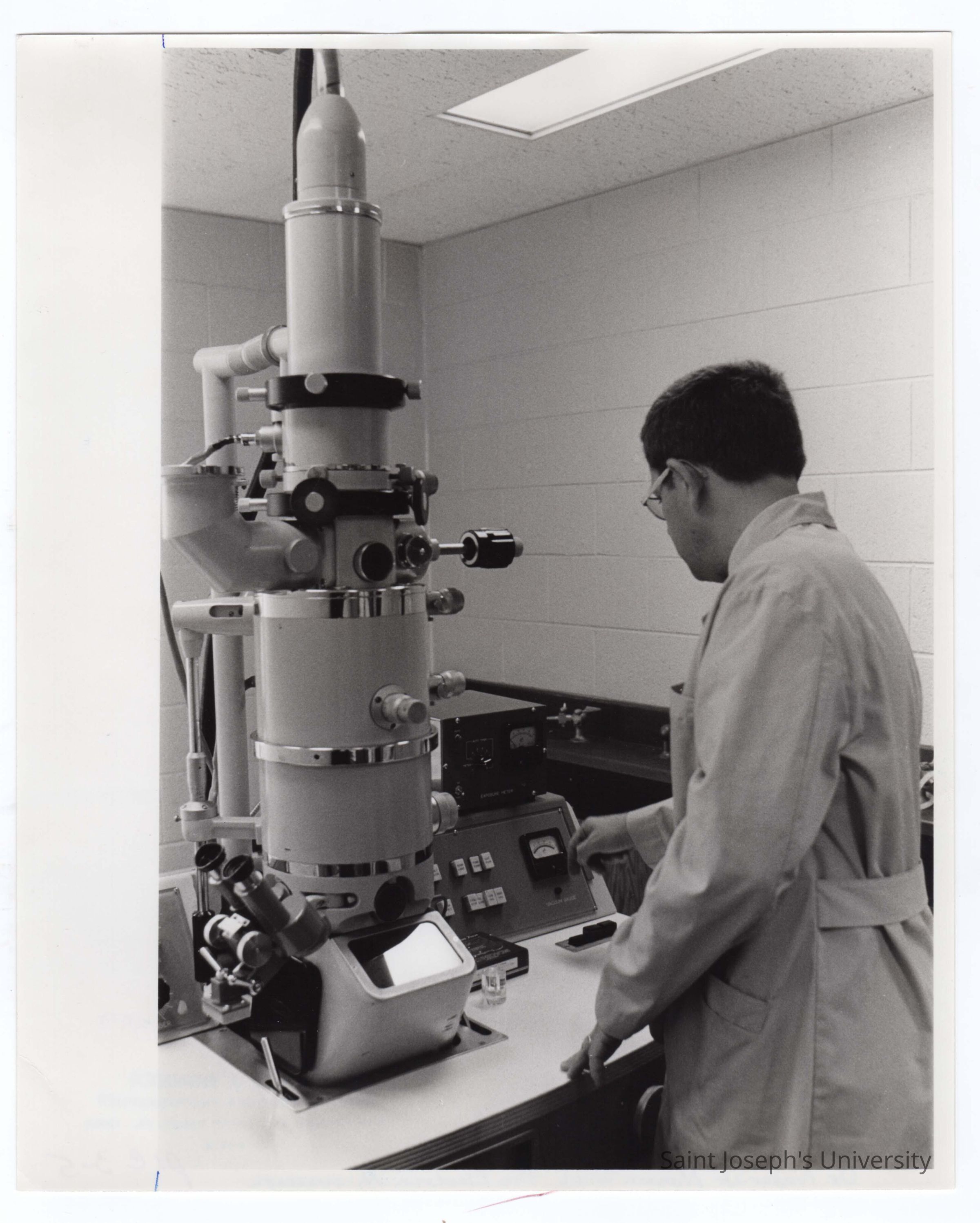 Biology professor, Frederick Monson, working with electron microscope, c. 1972.