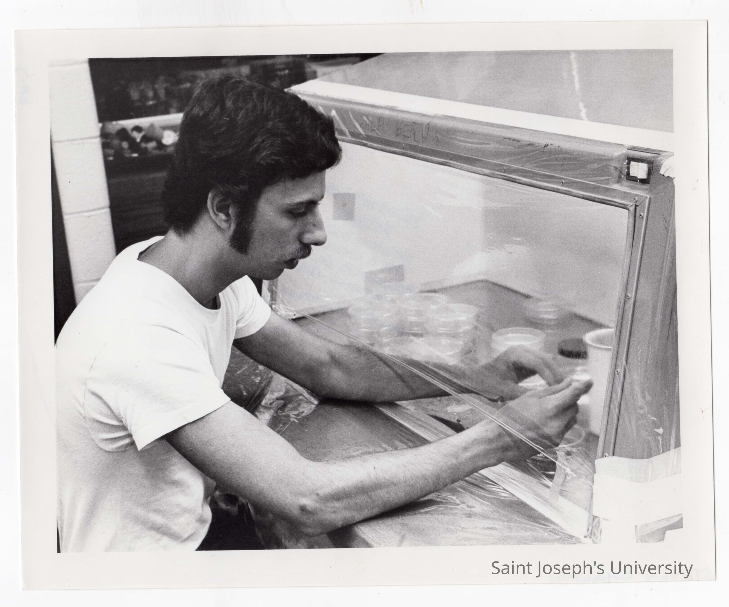 Biology student, Steven Chalfin, working on Crown Gall project in science laboratory, August 1975.