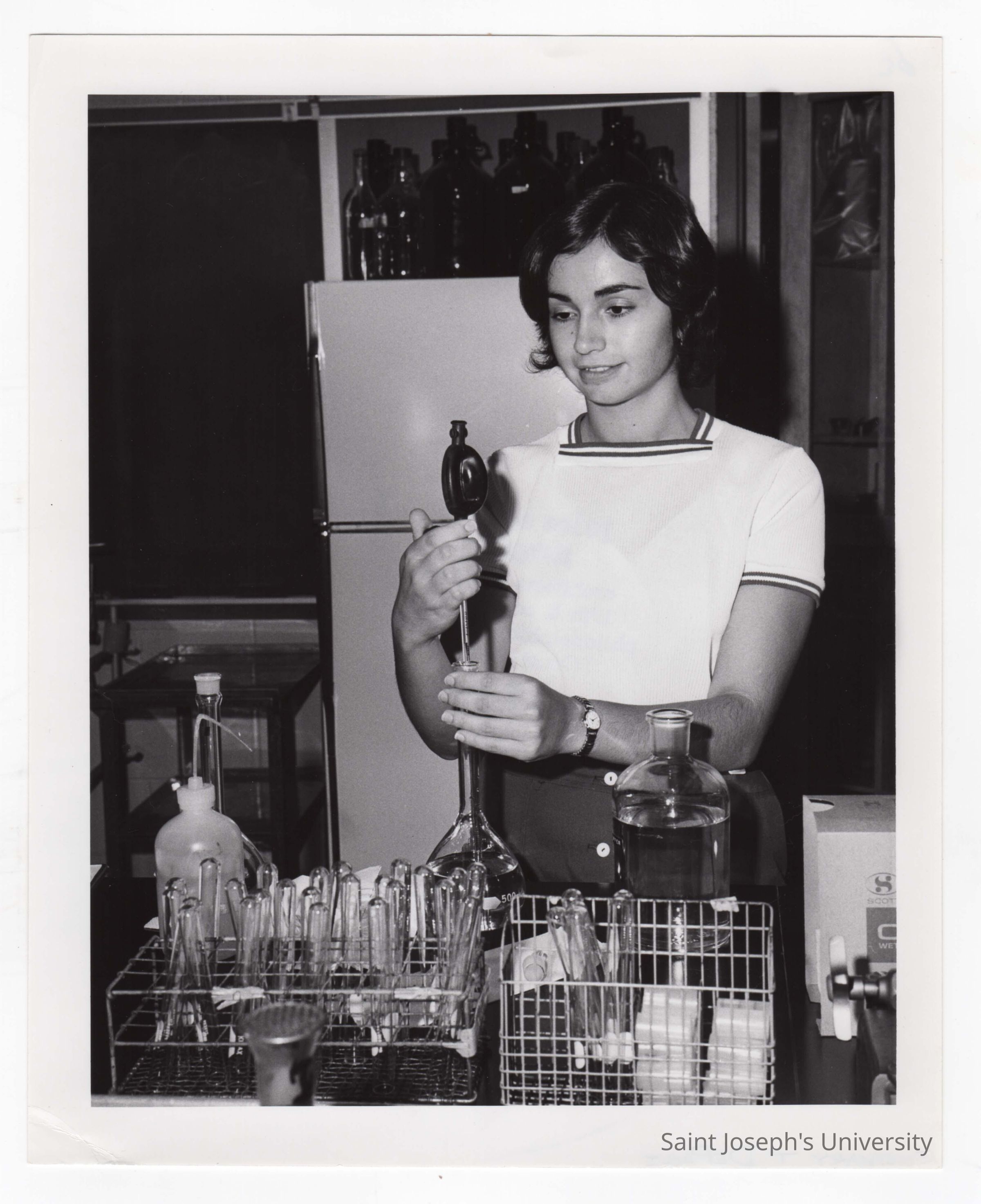 Biology student, Rosemary DePaoli, working on Crown Gall project in science laboratory, August 1975.