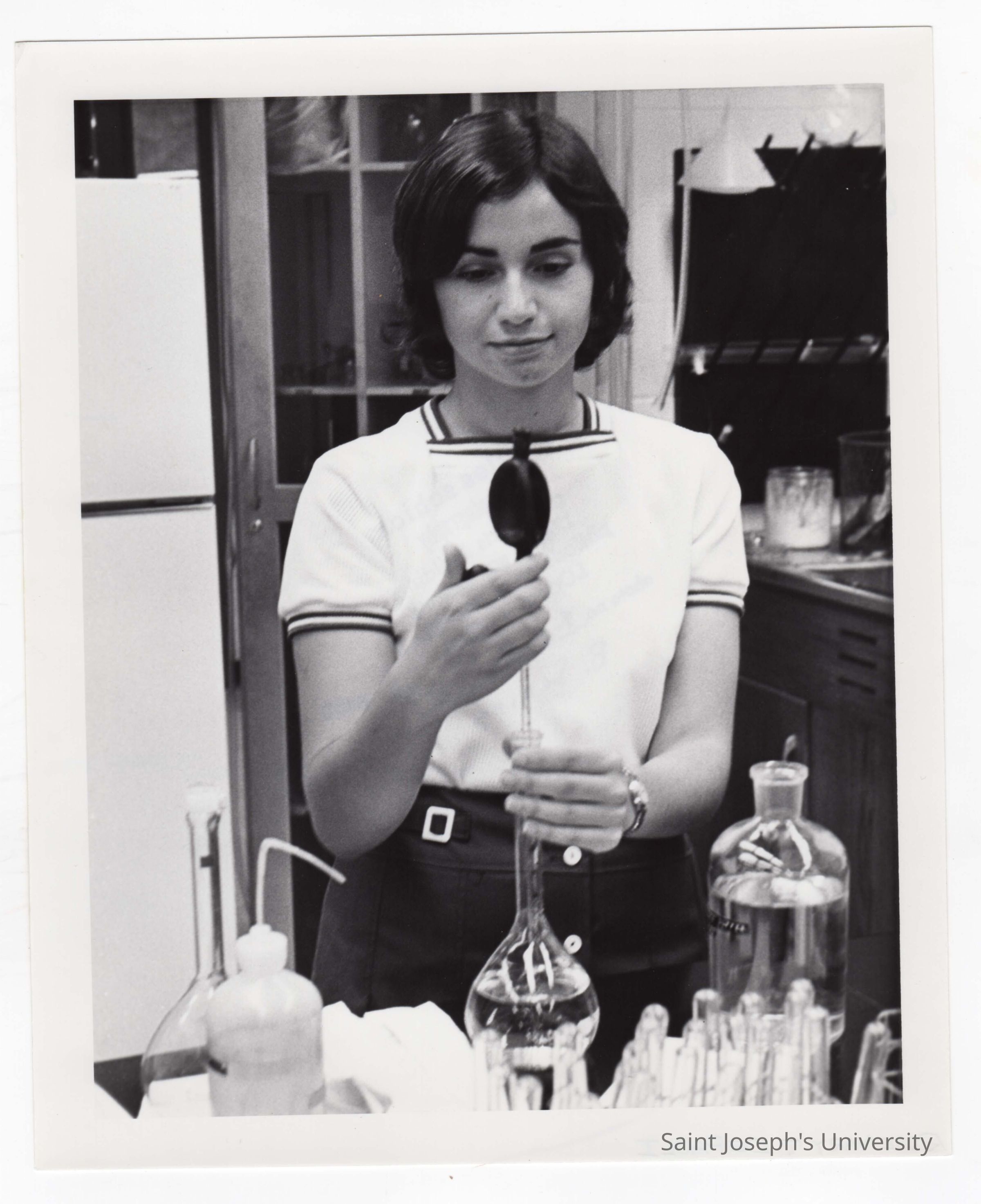 Biology student, Rosemary DePaoli, working on Crown Gall project in science laboratory, August 1975.
