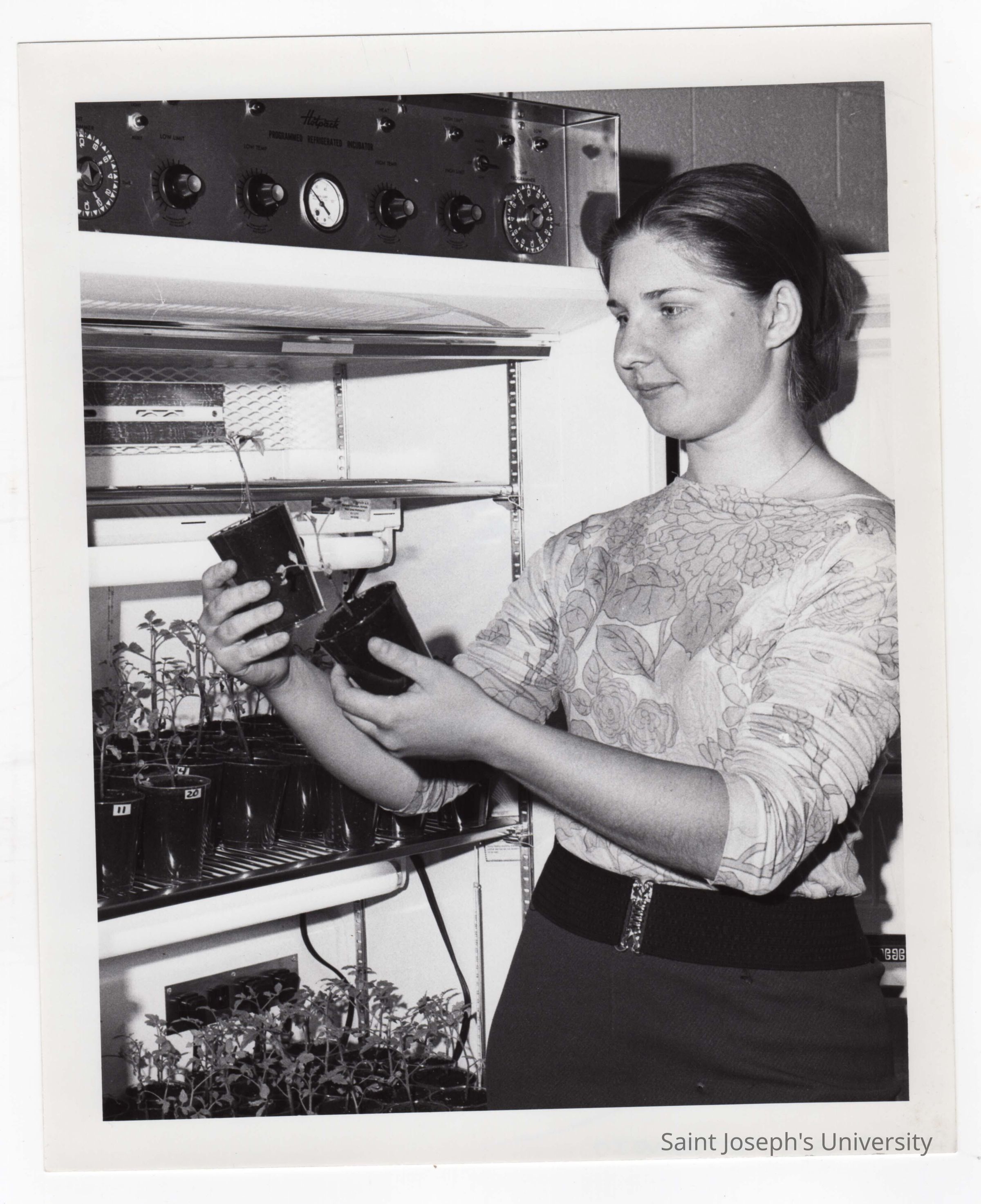 Biology student, Claudia Petruncio, working on Crown Gall project in science laboratory, August 1975.