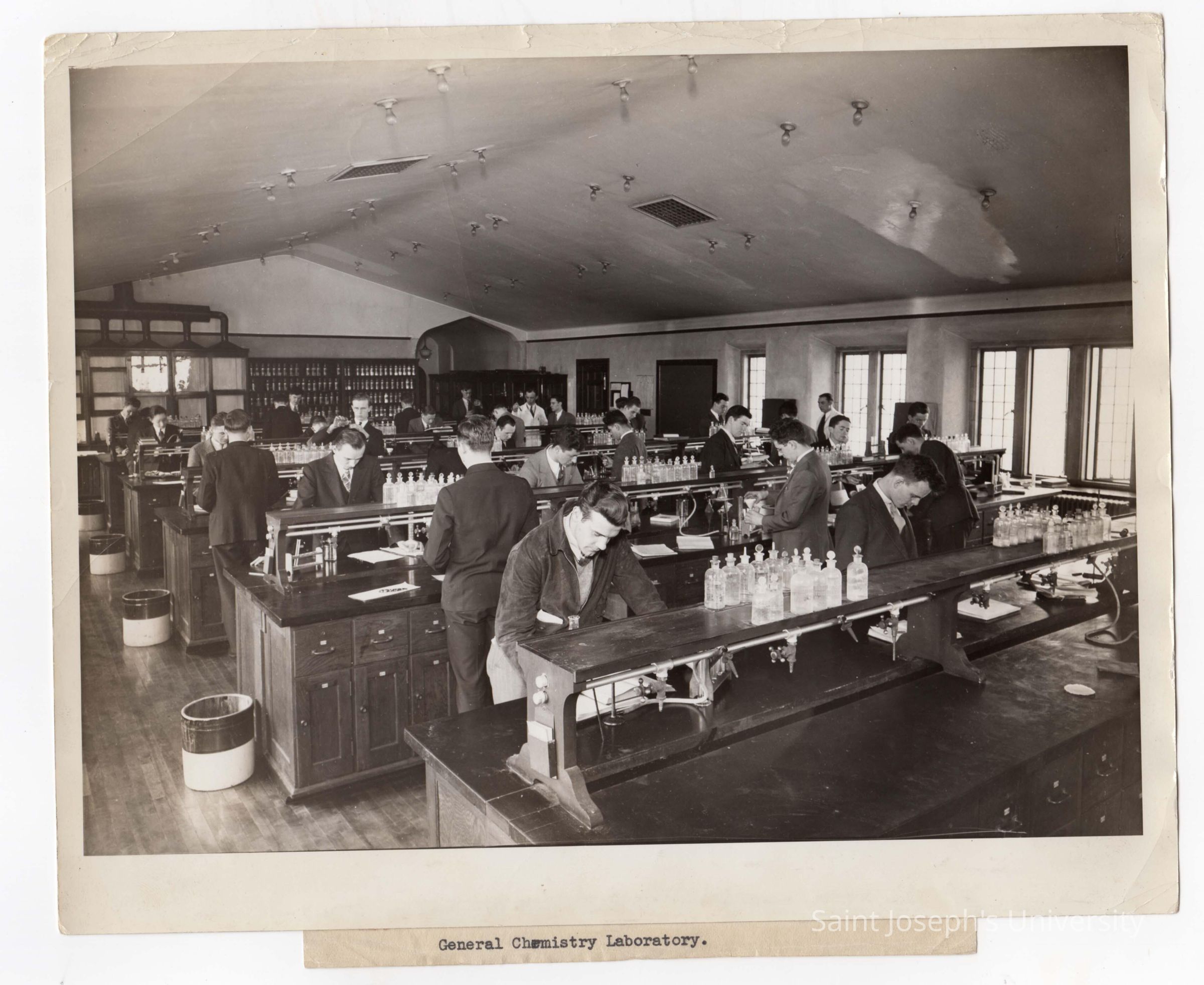 Students conducting science experiment in chemistry laboratory in Barbelin Hall, c. 1950.