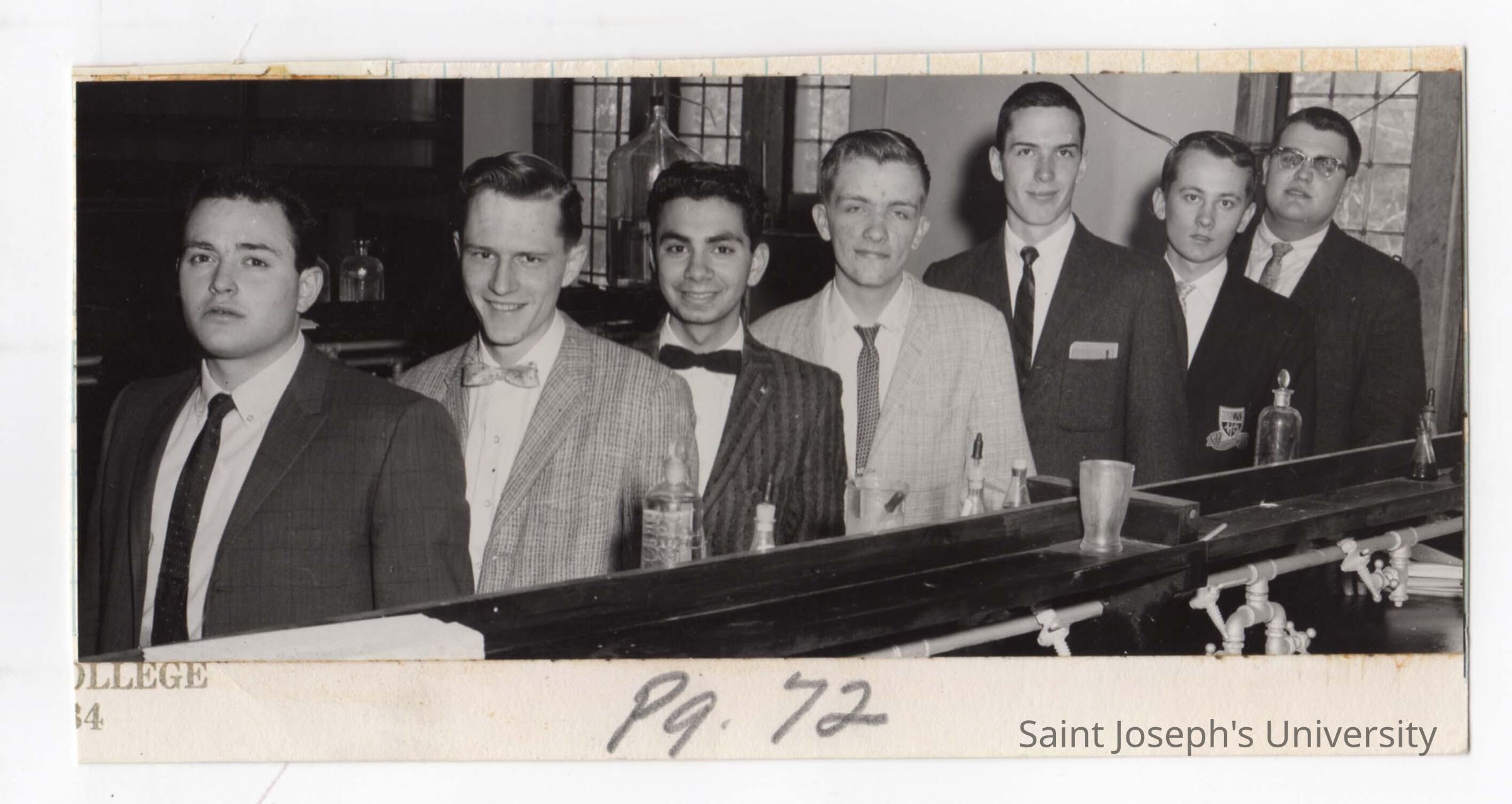 Chemistry students posing for picture in science laboratory in Barbelin Hall, c. 1955.