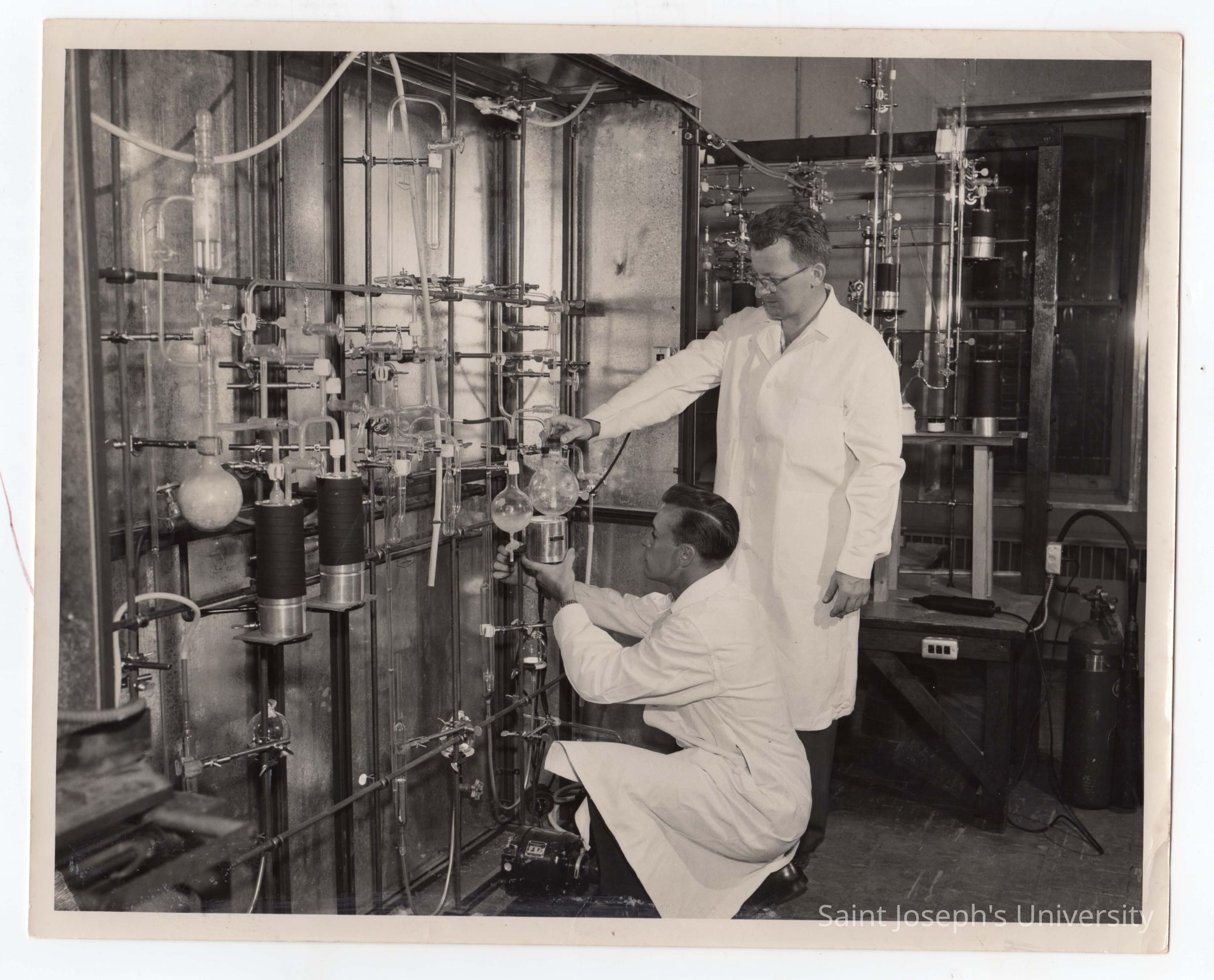 Two chemistry students conducting experiment in science laboratory, July 1955.