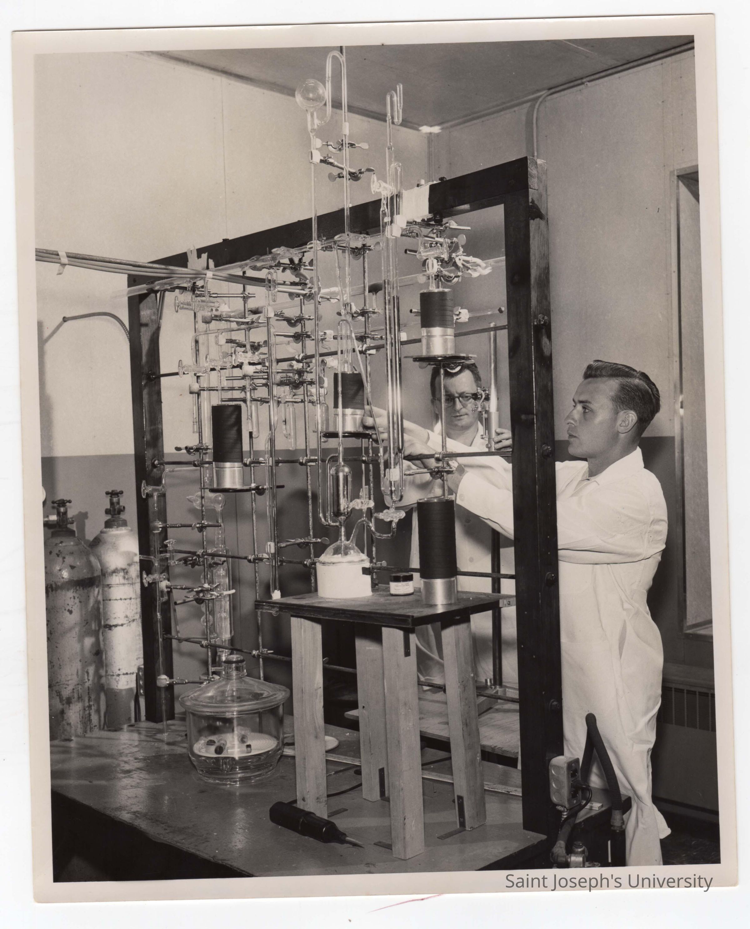 Two chemistry students conducting experiment in science labortory, July 1955.