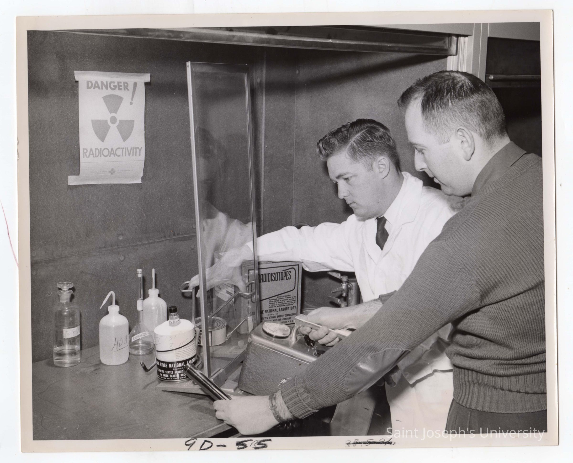 Chemistry professor, Joseph Feighan, with graduate student, Robert Weiner in science laboratory, February 1958.