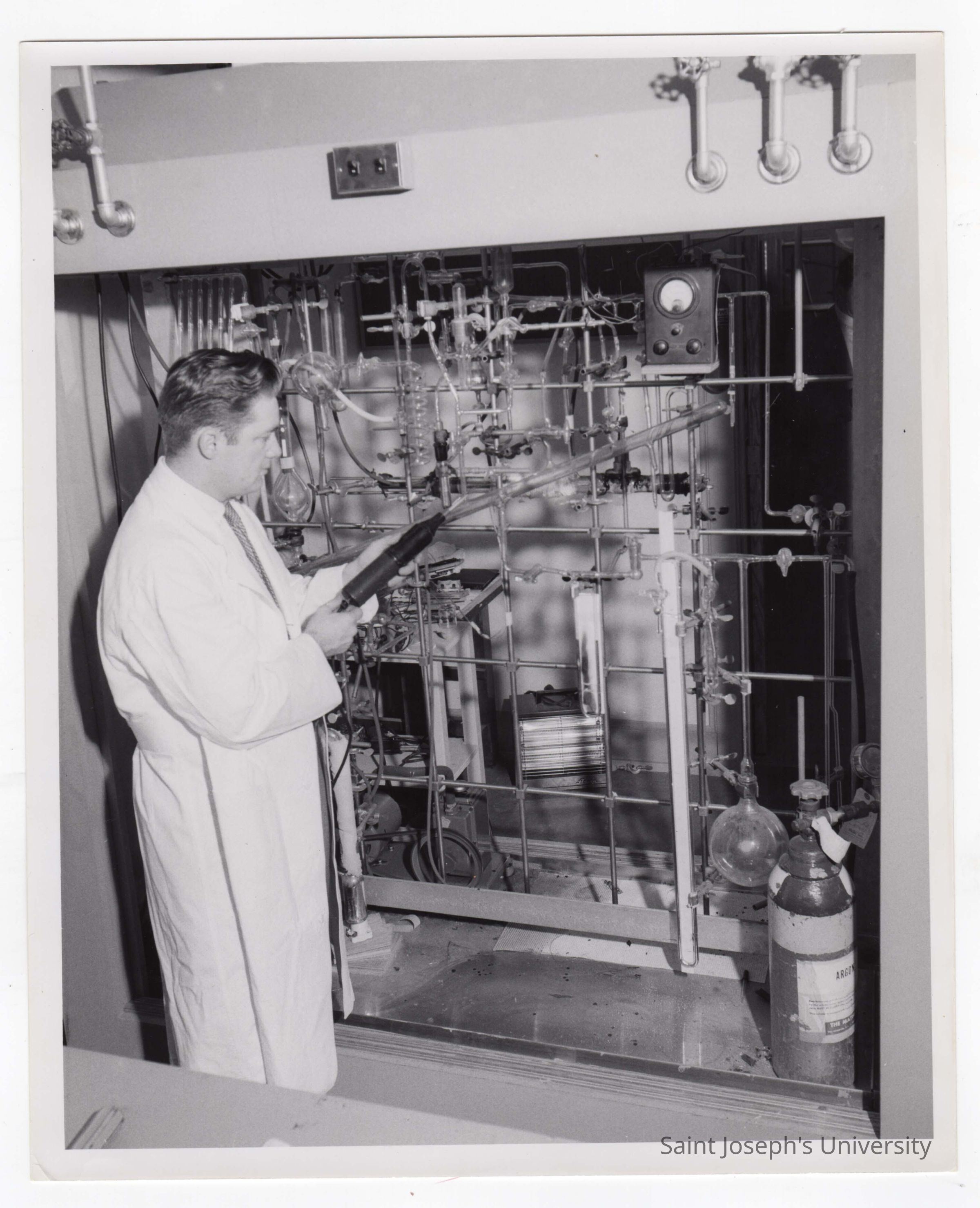 Chemistry professor, Joseph Feighan, in science laboratory, May 1959.