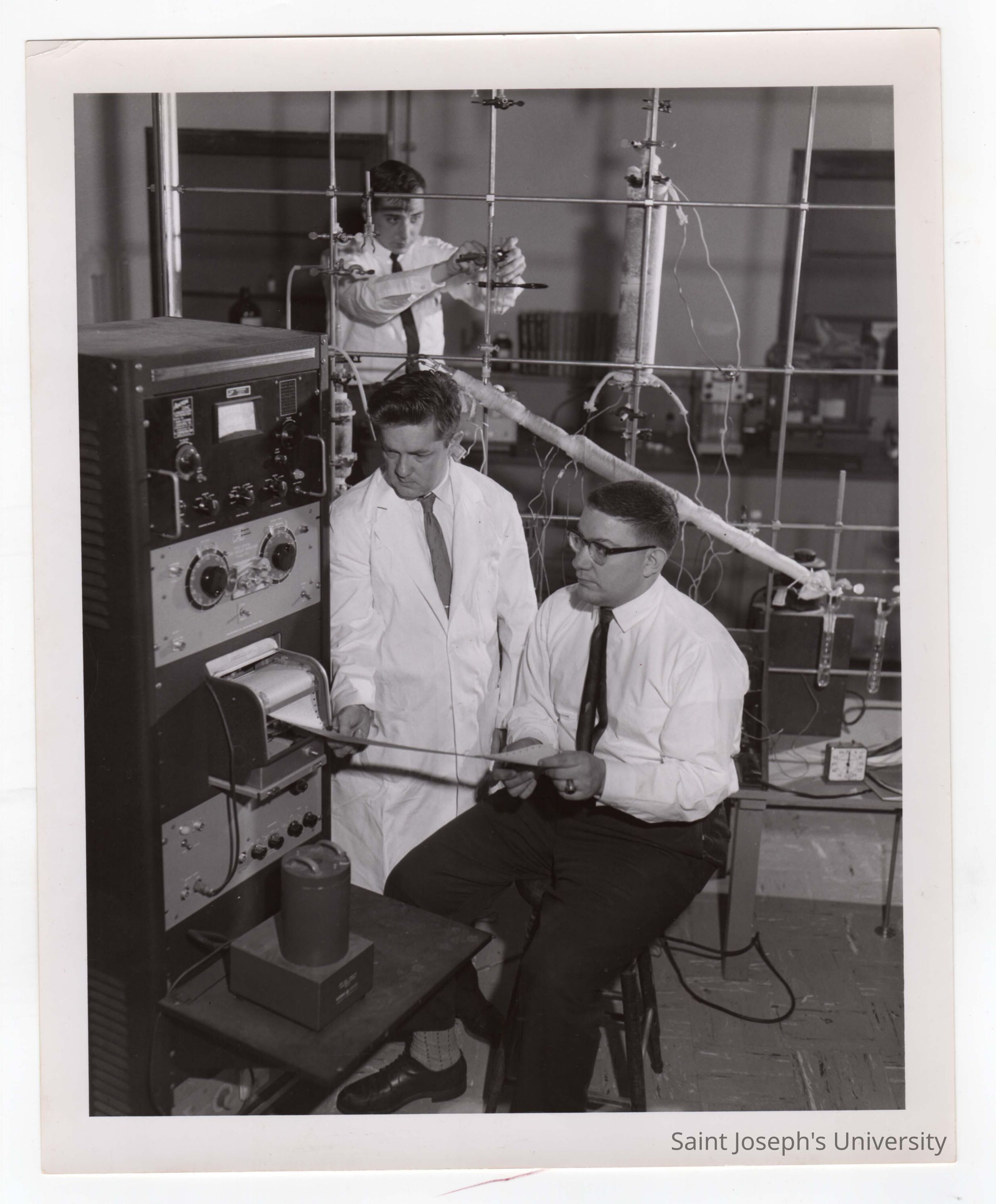 Chemistry professor, Joseph Feighan, with graduate students in science laboratory, February 1963.