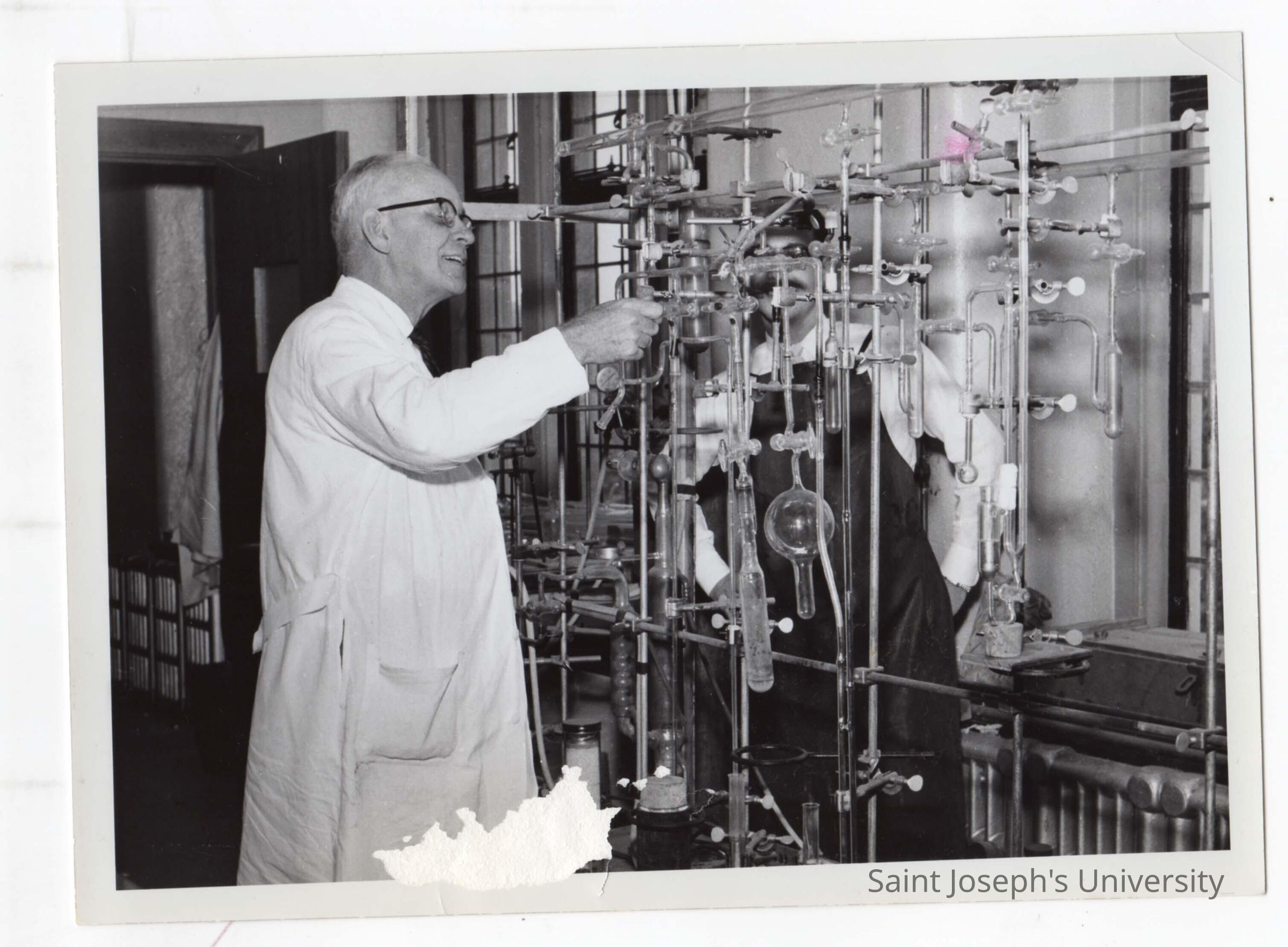 Chemistry professor, Joseph Bartlett, and student working in laboratory, c. 1965.