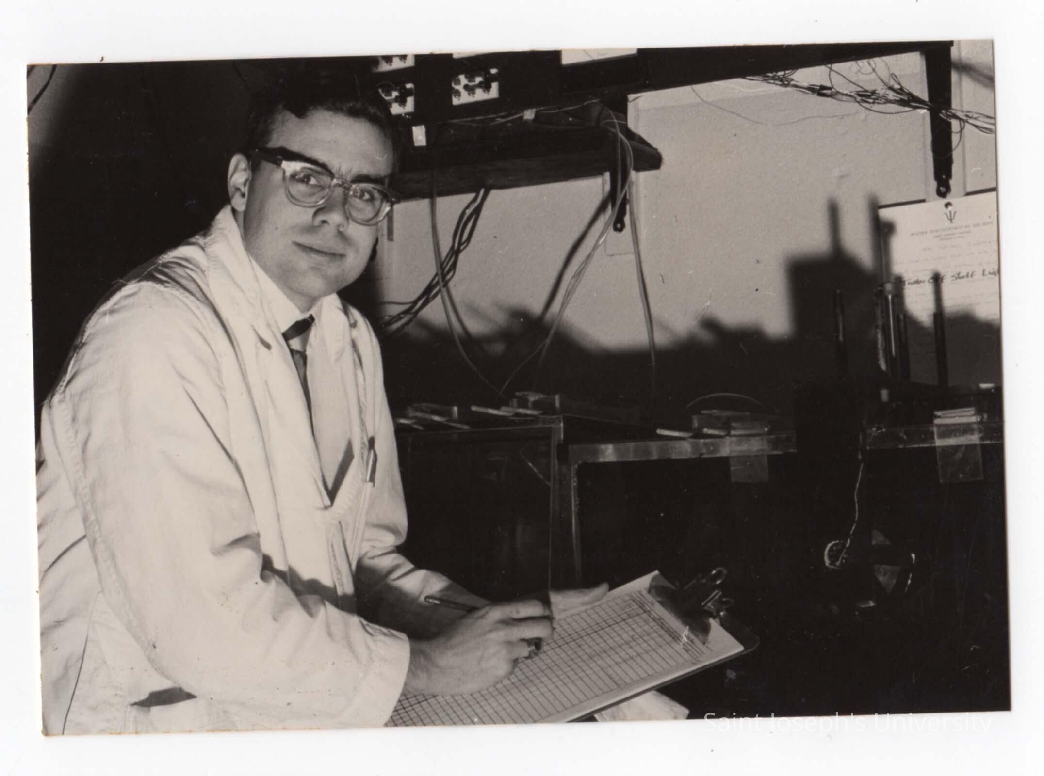 Graduate chemistry student holding clipboard with data sheets in science laboratory, c. 1965.