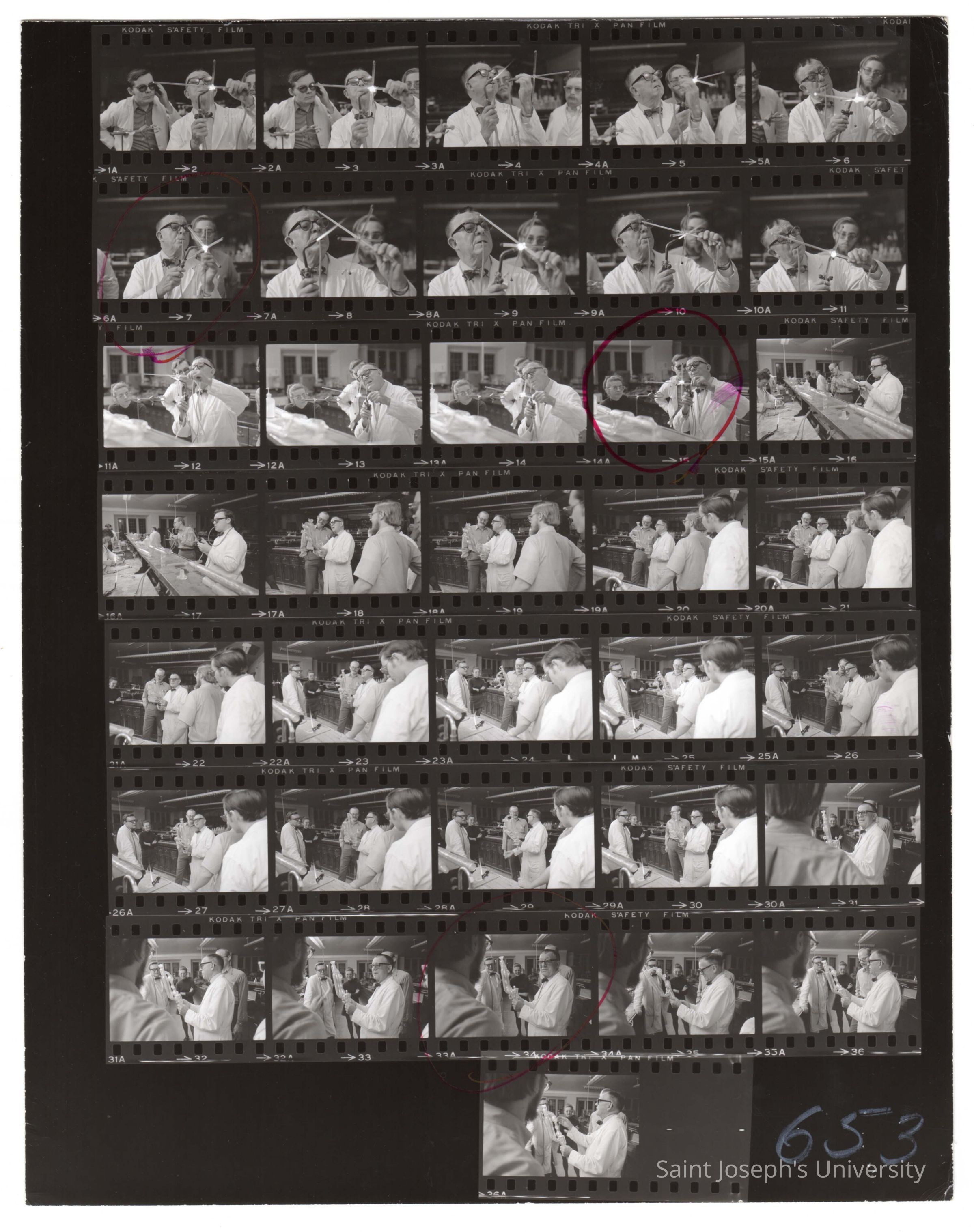 Views of students and professor in glass blowing course offered by Chemistry Department, c. 1965.