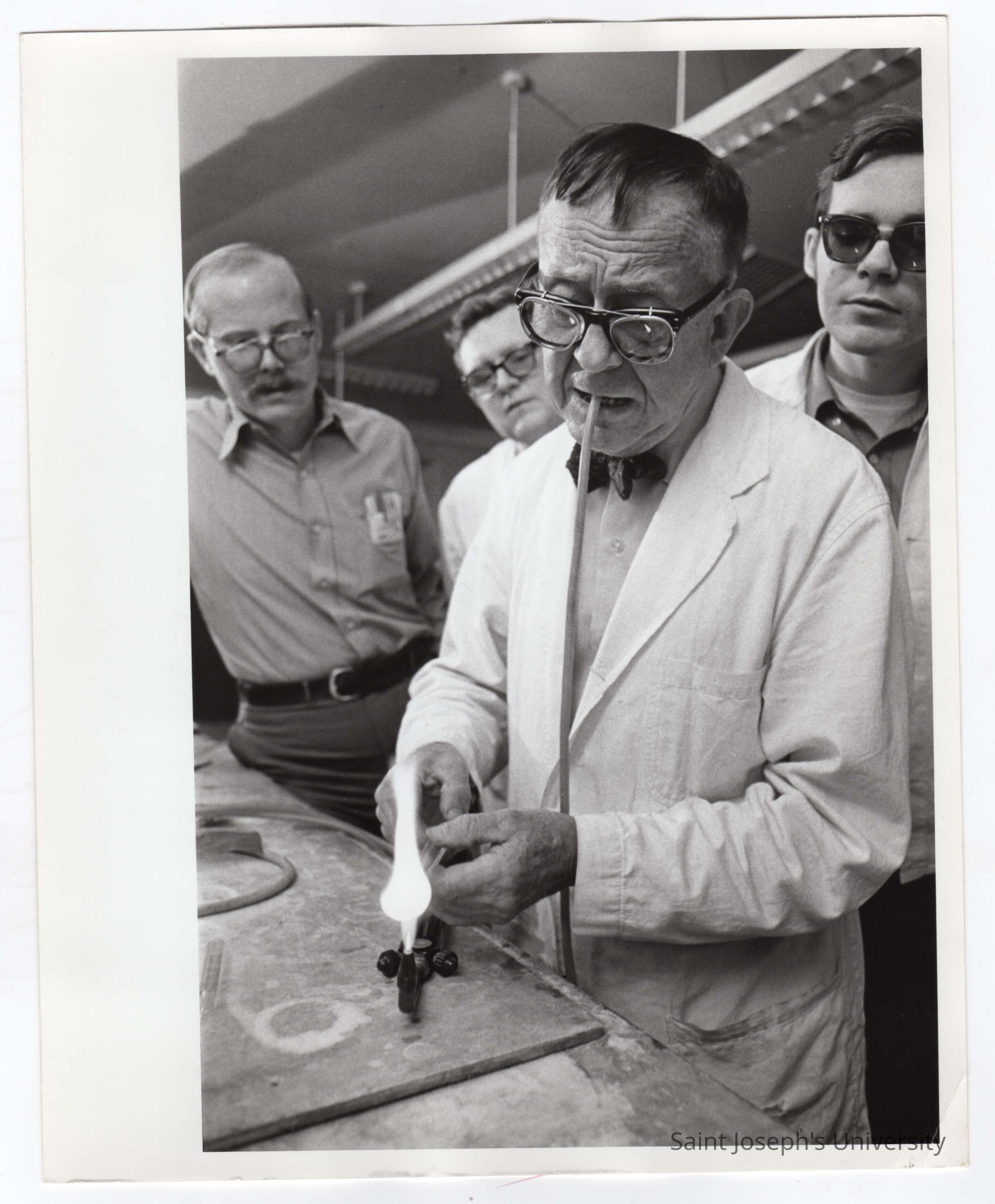 Students and professor in glass blowing course offered by Chemistry Department, c. 1965.