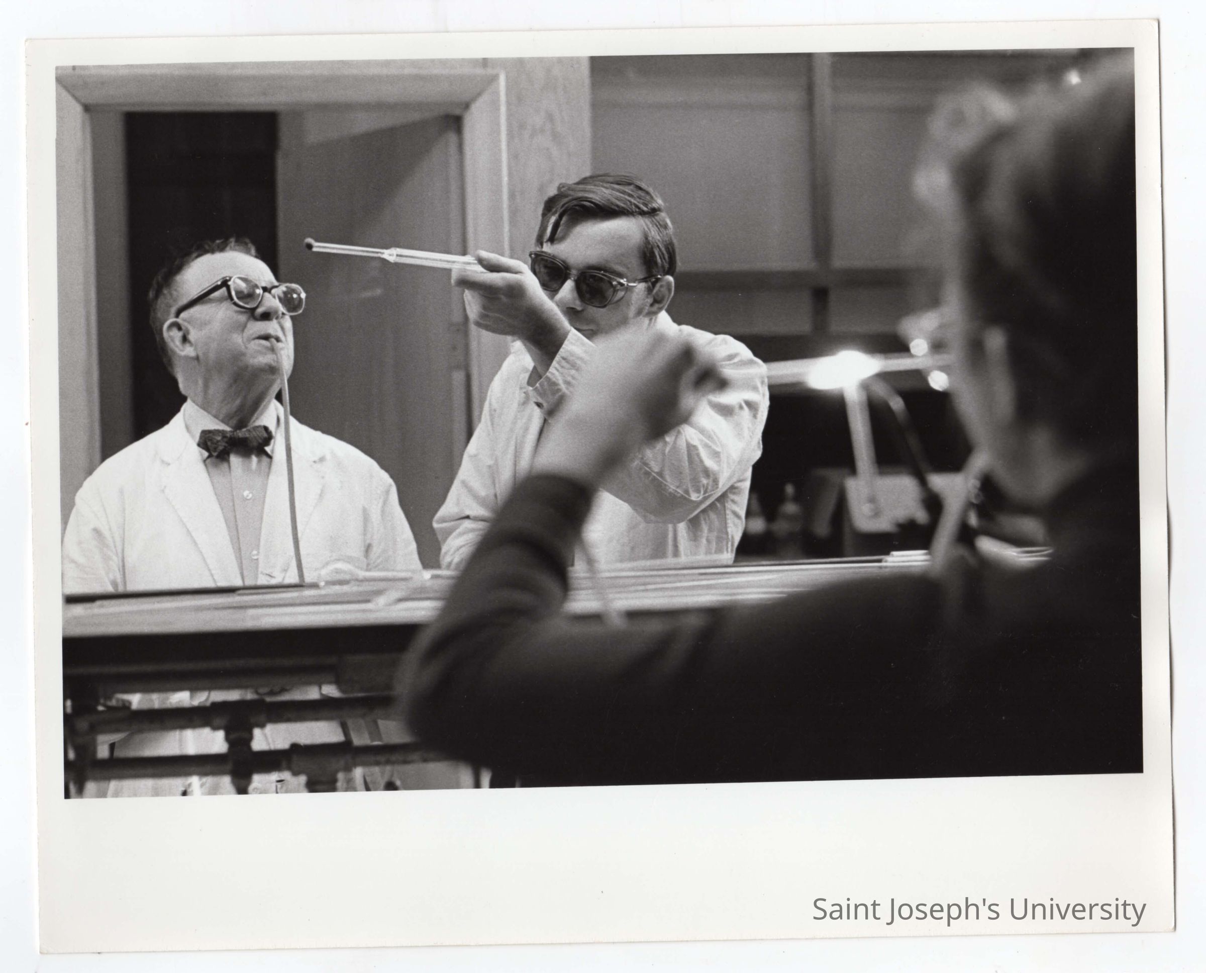 Students and professor in glass blowing course offered by Chemistry Department, c. 1965.
