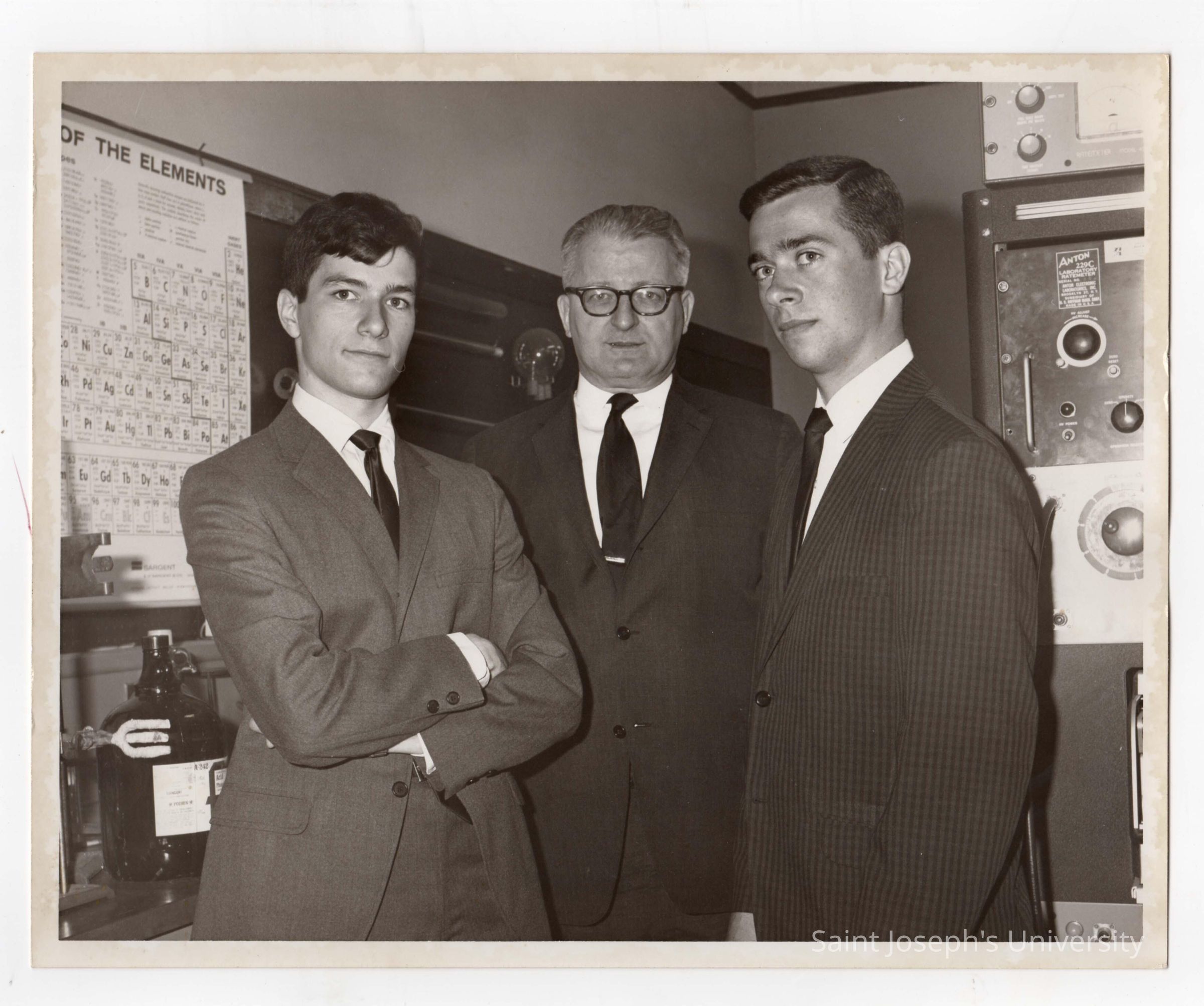 Chemistry professor, George Beichl, with two students, Michael F. Schmid and Henry M. Miziorko, who won appointments to work for a semester at the Argonnne National Laboratory in Argonne, Illinois, May 1968.