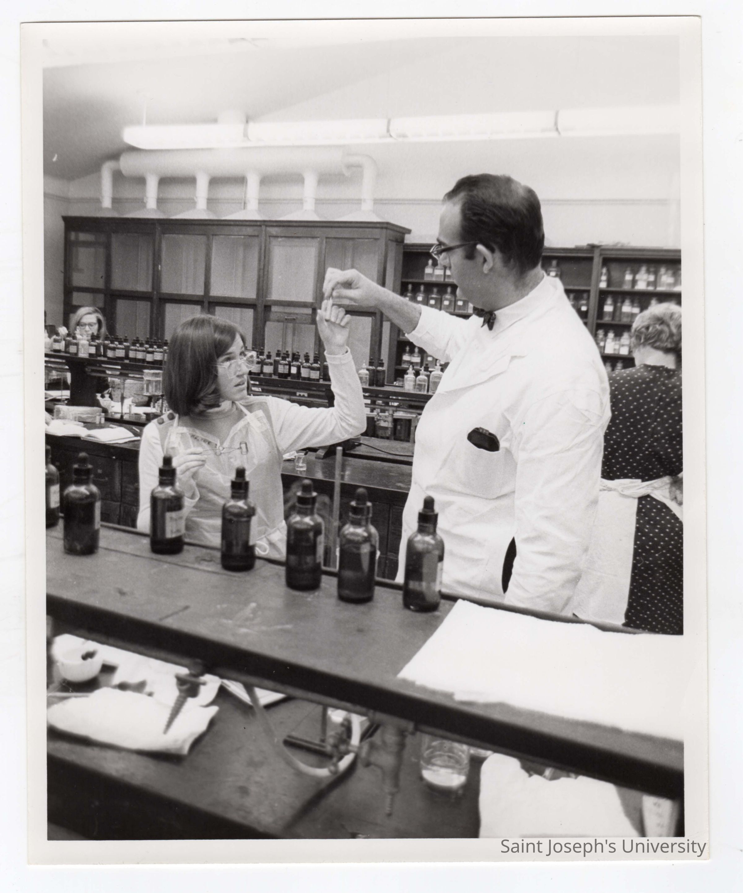 Chemistry professor working in science laboratory with several students, c. 1968.