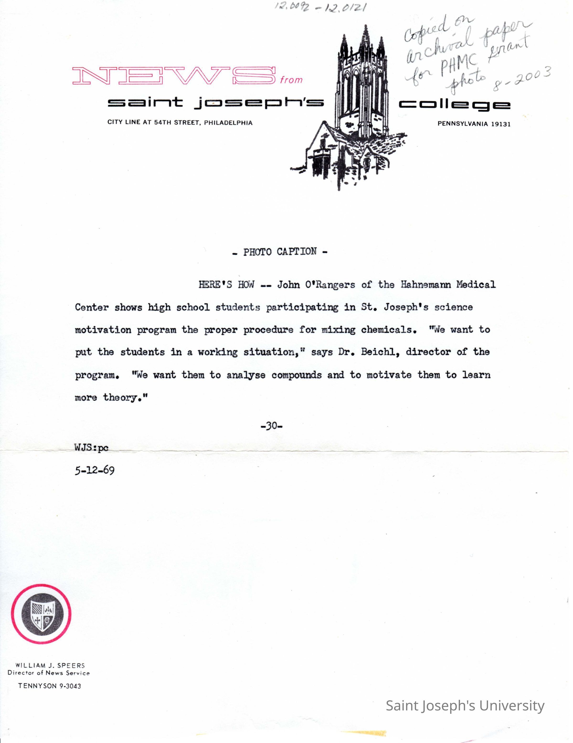 William F. Maloney, S.J., with high school students participating in Chemistry Department's Science Motivation Program, spring 1968. Included are: Mrs. Rebecca Segal, Dominic Roberti, George Beichl, and others.