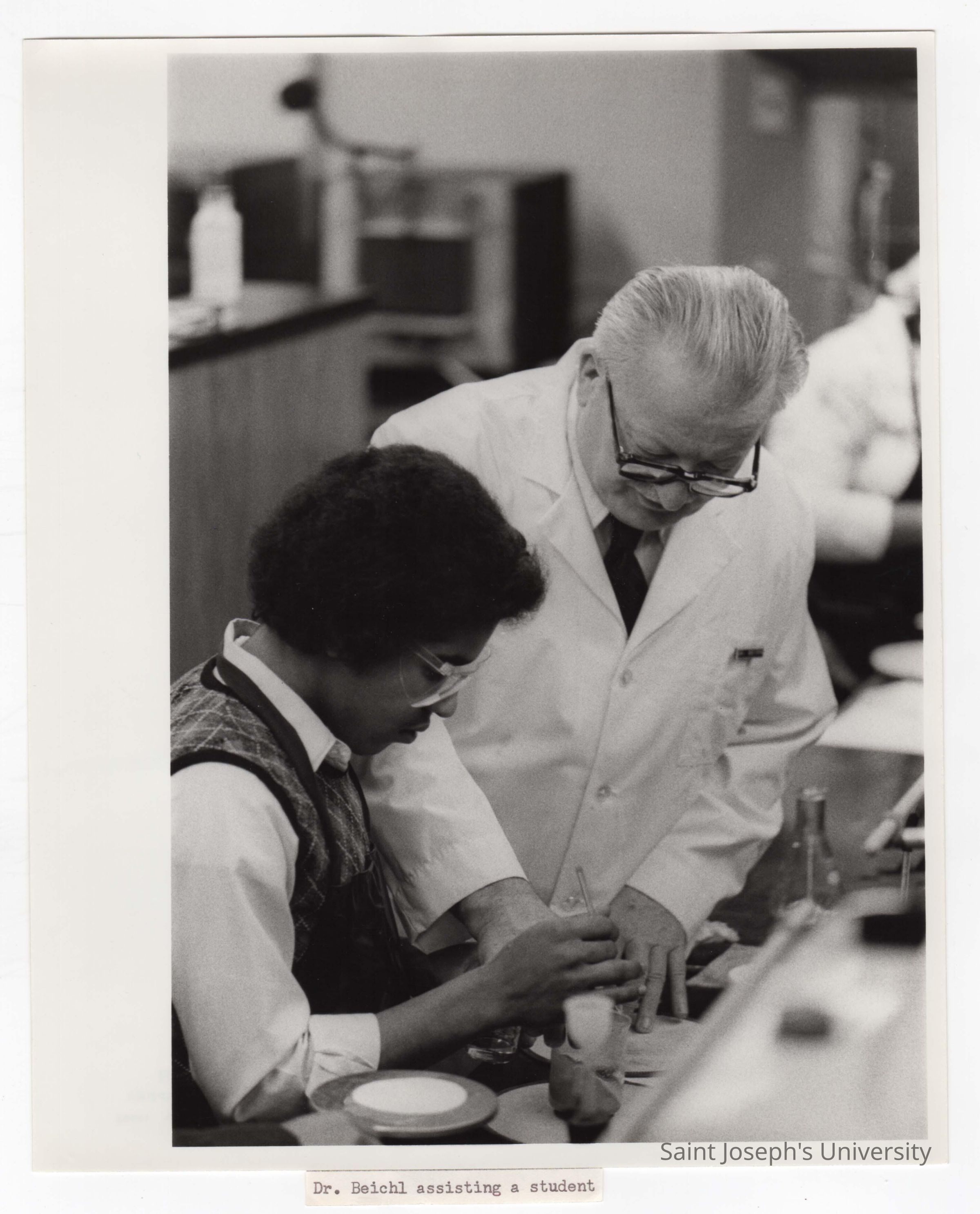 George Beichl, SJC chemistry professor, working with a high school student in laboratory as part of Chemistry Department's Science Motivation Program, c. 1972.