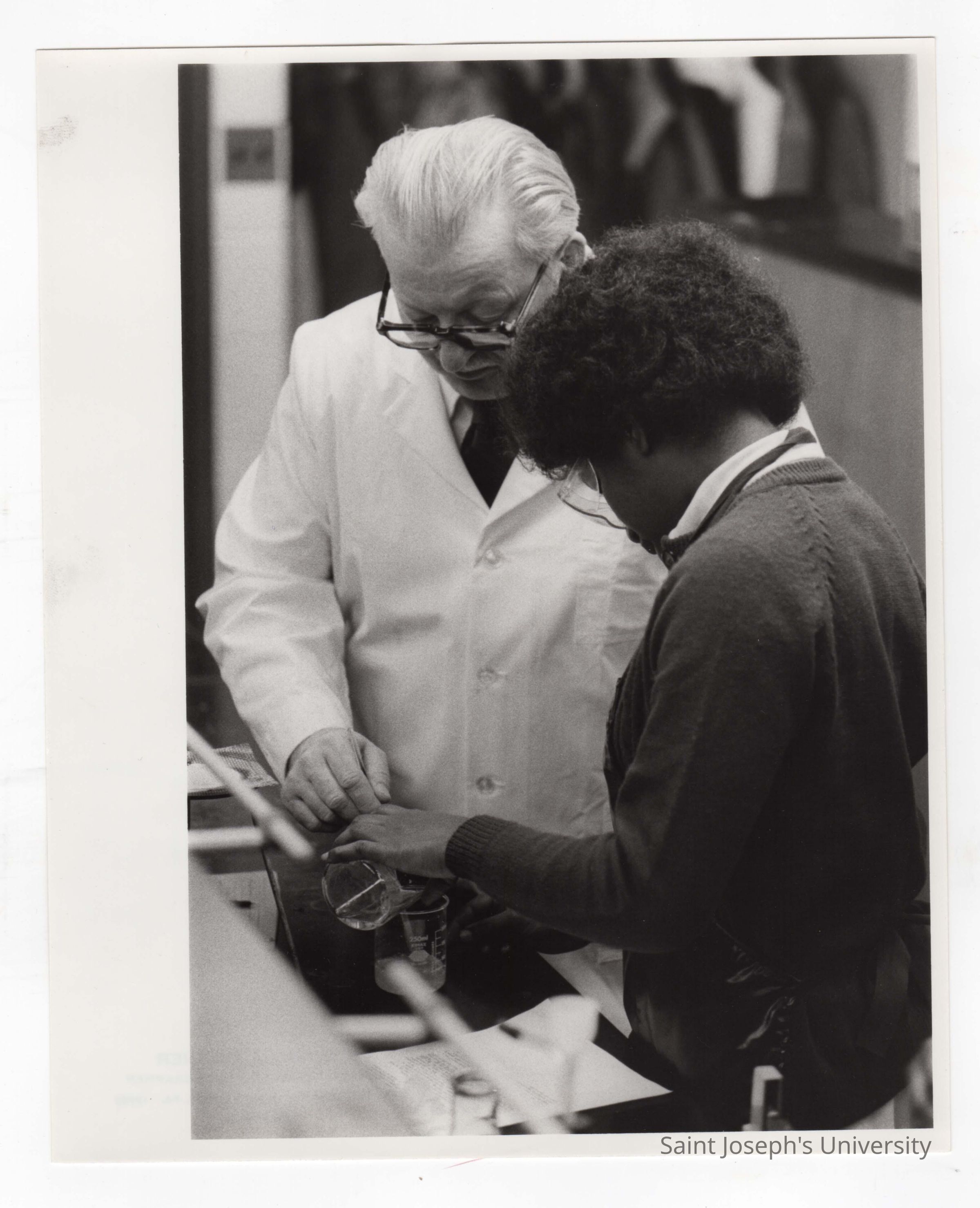 George Beichl, SJC chemistry professor, working with a high school student in laboratory as part of Chemistry Department's Science Motivation Program, c. 1972.