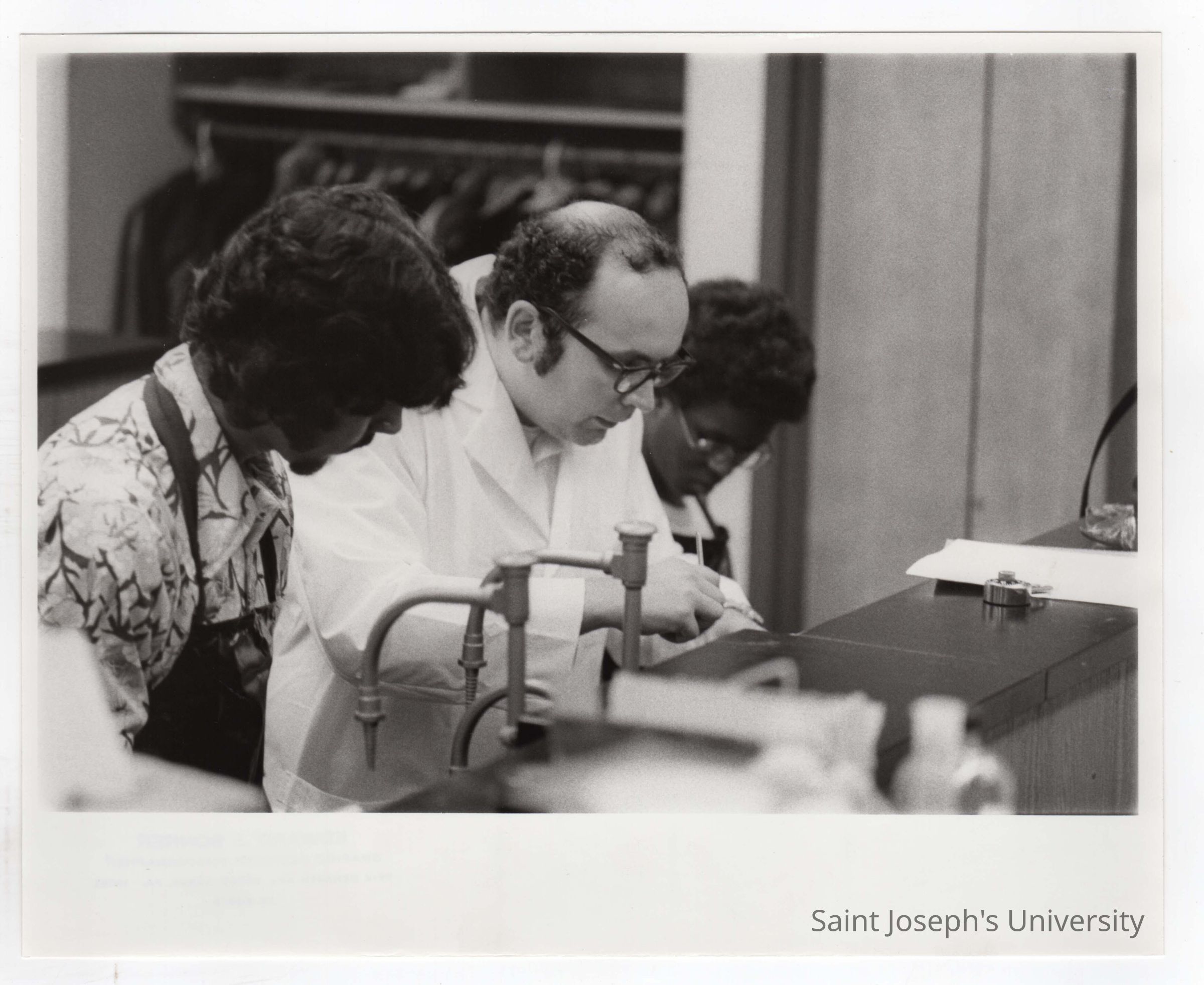 SJC chemistry professor working with a high school student in laboratory as part of Chemistry Department's Science Motivation Program, c. 1972.
