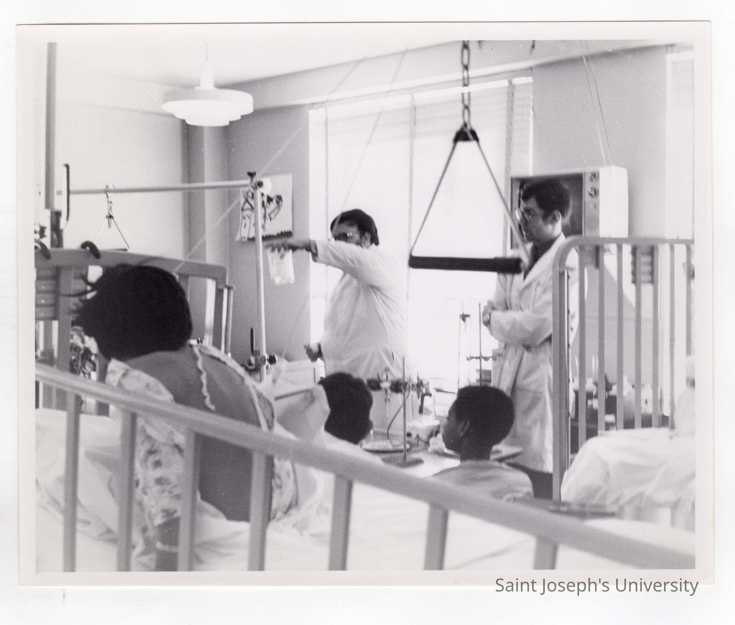 Thomas Dolan and Peter Burghart of Molloy Chemical Society conducting experiments and demonstrations for children who were patients at Children's Hospital of Philadelphia, 1971.