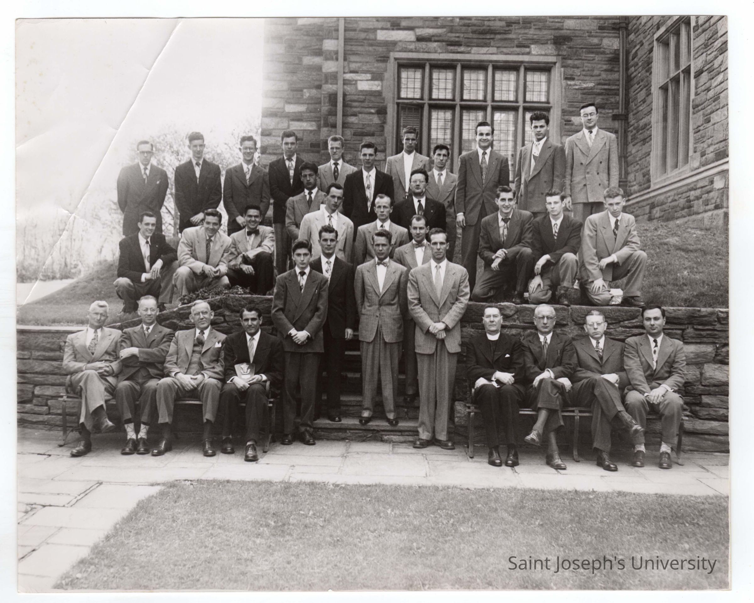 Induction of students into Physics Department fraternity, c. 1947, with John S. O'Conor, S.J., and others.