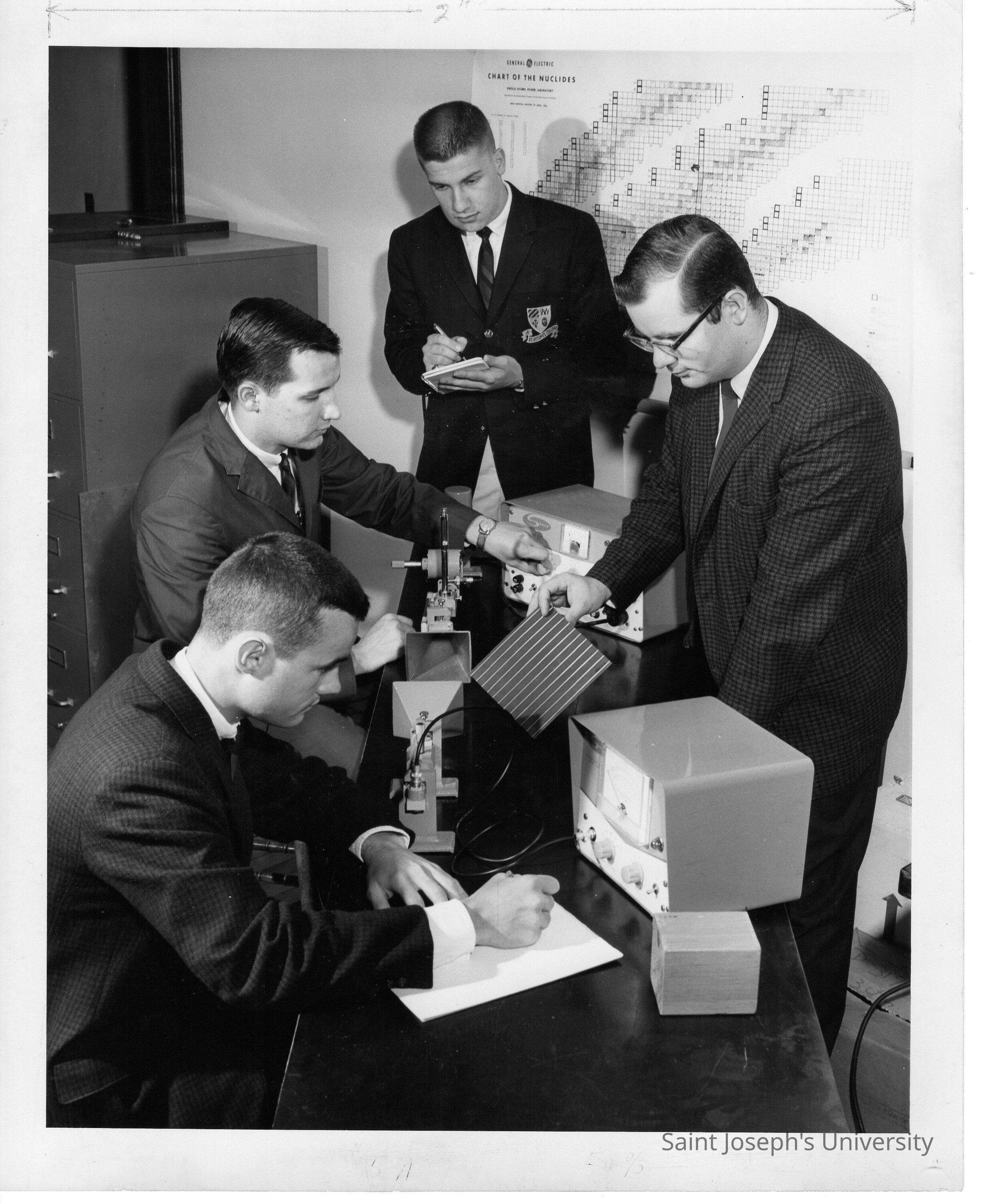 Physics professor working with several students in microwave laboratory, May 1963.