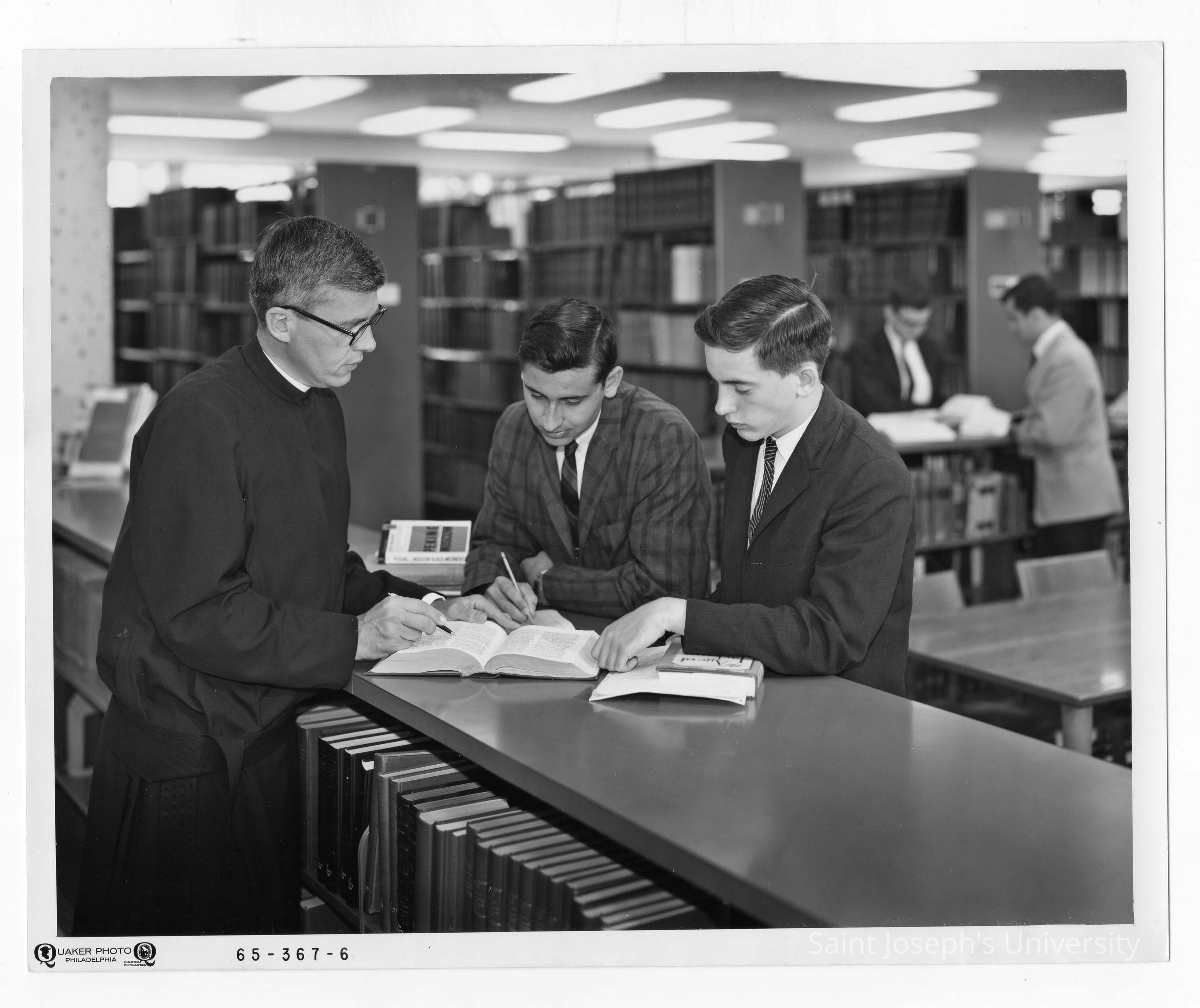 Jerome Coll, S.J., working with two students in Honors Program in Drexel Library, c. 1968.