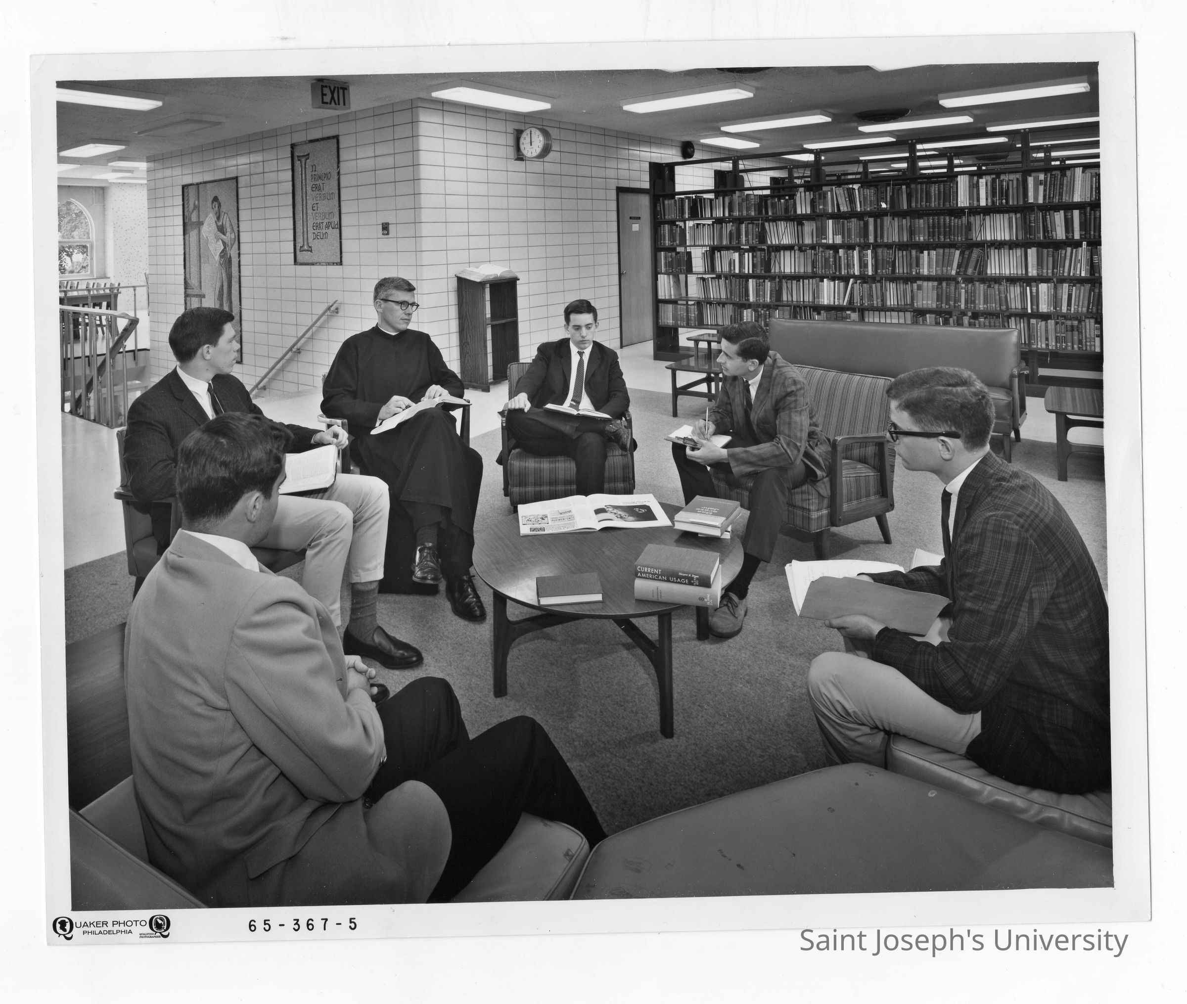 Jerome Coll, S.J., holding Honors Program class in Drexel Library, c. 1968.