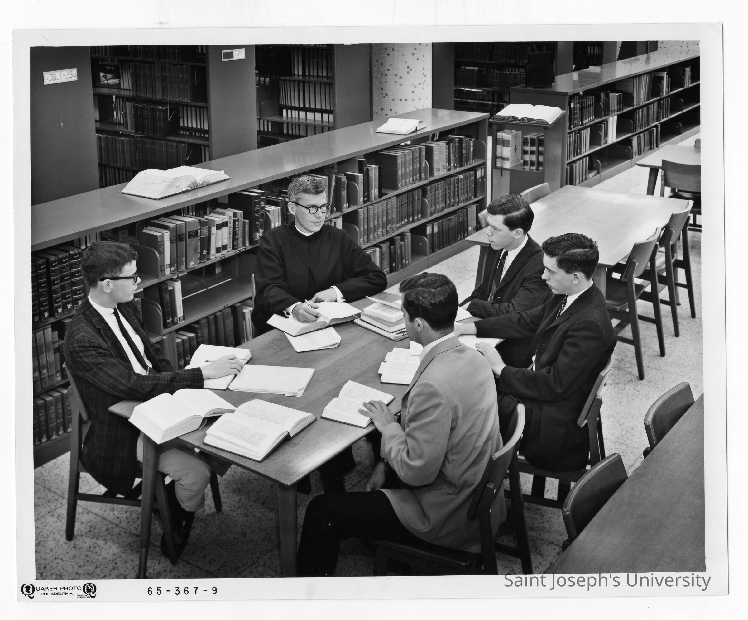 Jerome Coll, S.J., holding Honors Program class in Drexel Library, c. 1968.