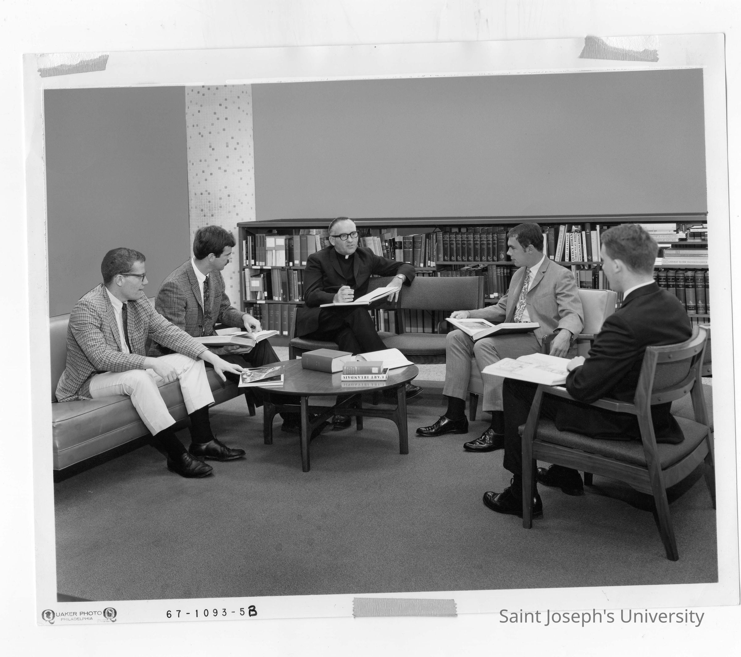 Thomas Loughrey, S.J., having discussion with Honors Program class in Drexel Library, c. 1970.