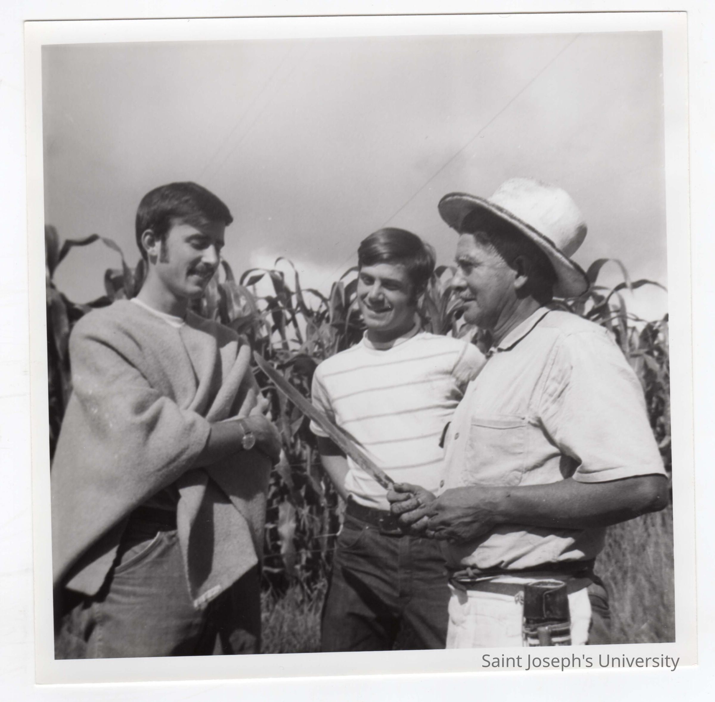 Two students standing with Colombian farmer holding machete knife near corn field during during Latin American Studies Institute Summer Service Project, summer 1970.