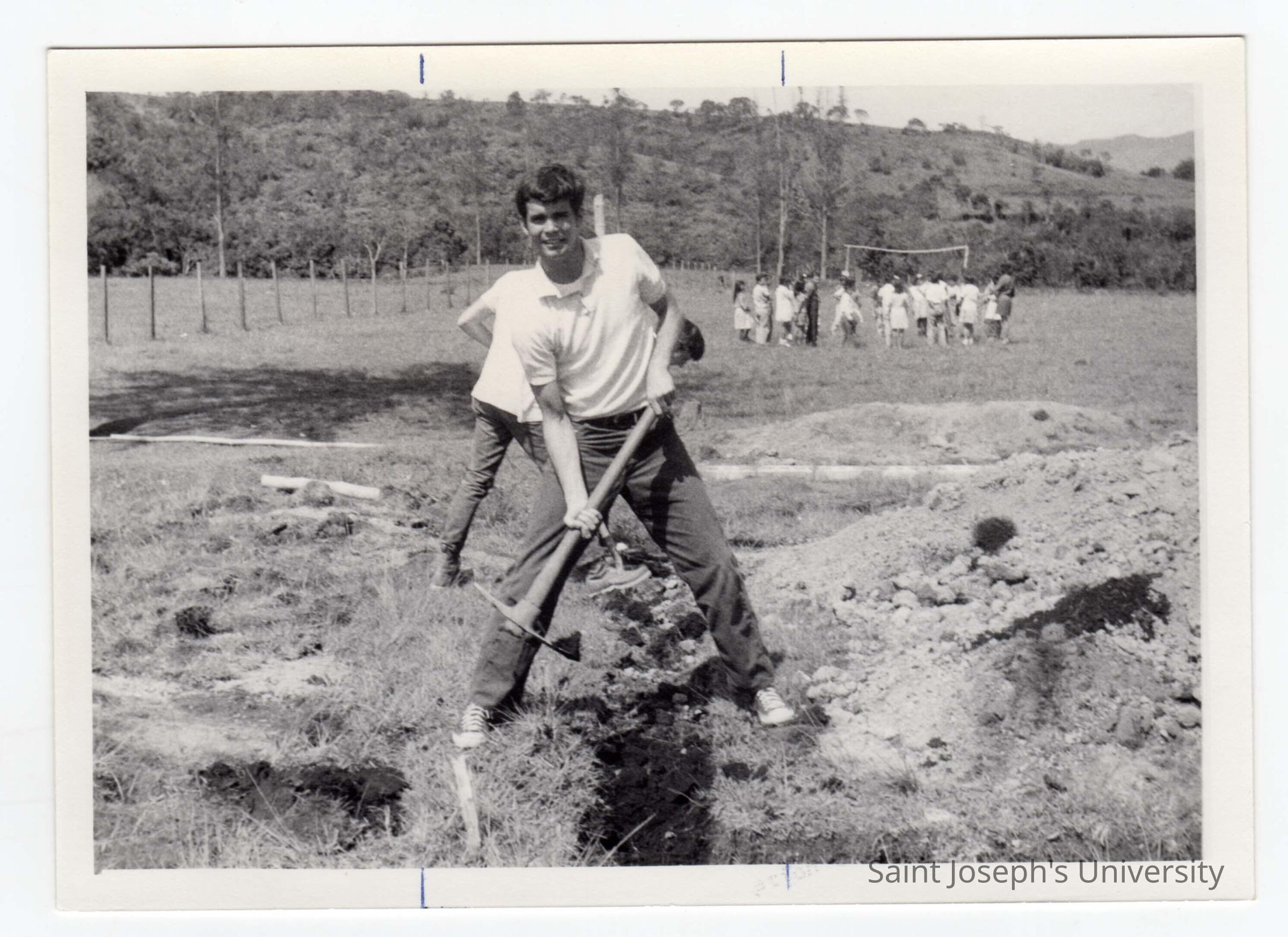 Two students working in field in Colombia with group of children in background during Latin American Studies Institute Summer Service Project, summer 1970.