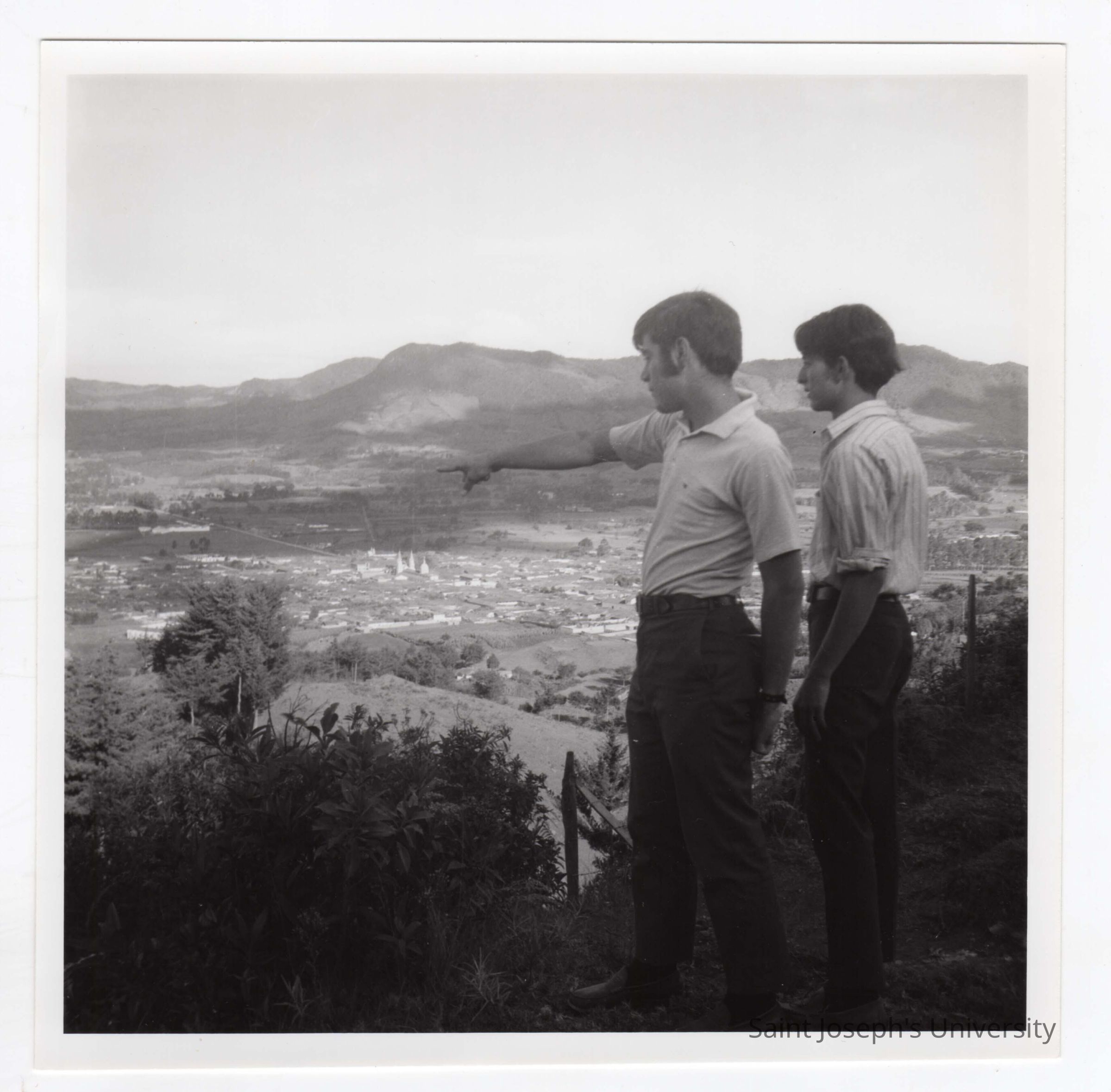 Two students standing on hilltop overlooking valley in Colombia during Latin American Studies Institute Summer Service Project, summer 1970.