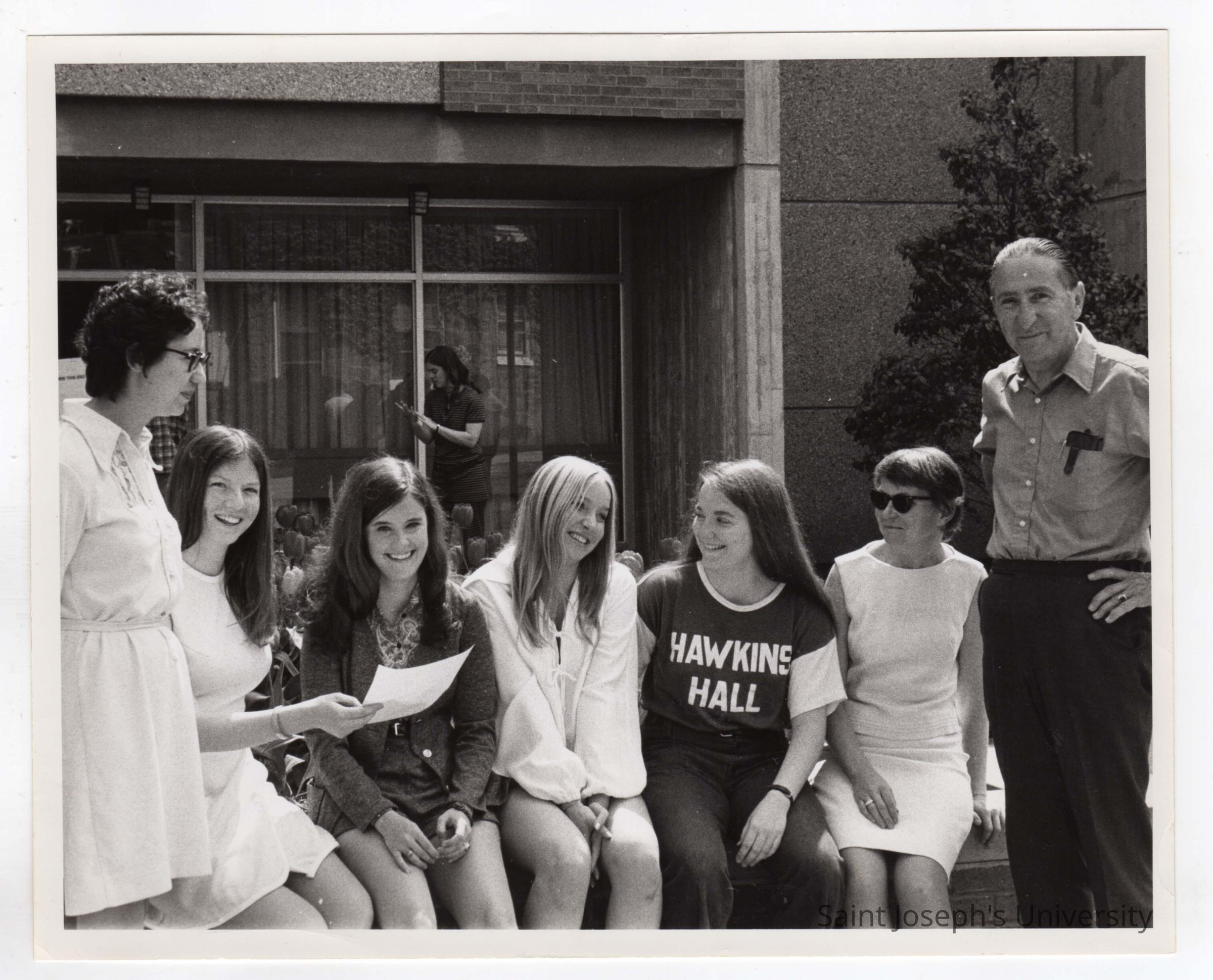 View of students (Heckrote, O'Doherty, Woods, Baldwin, Daly, Darroll, Uribe) prior to departing for annual community service project in Colombia as part of Latin American Studies Institute Summer Service Project, 1972.Entry/Object ID