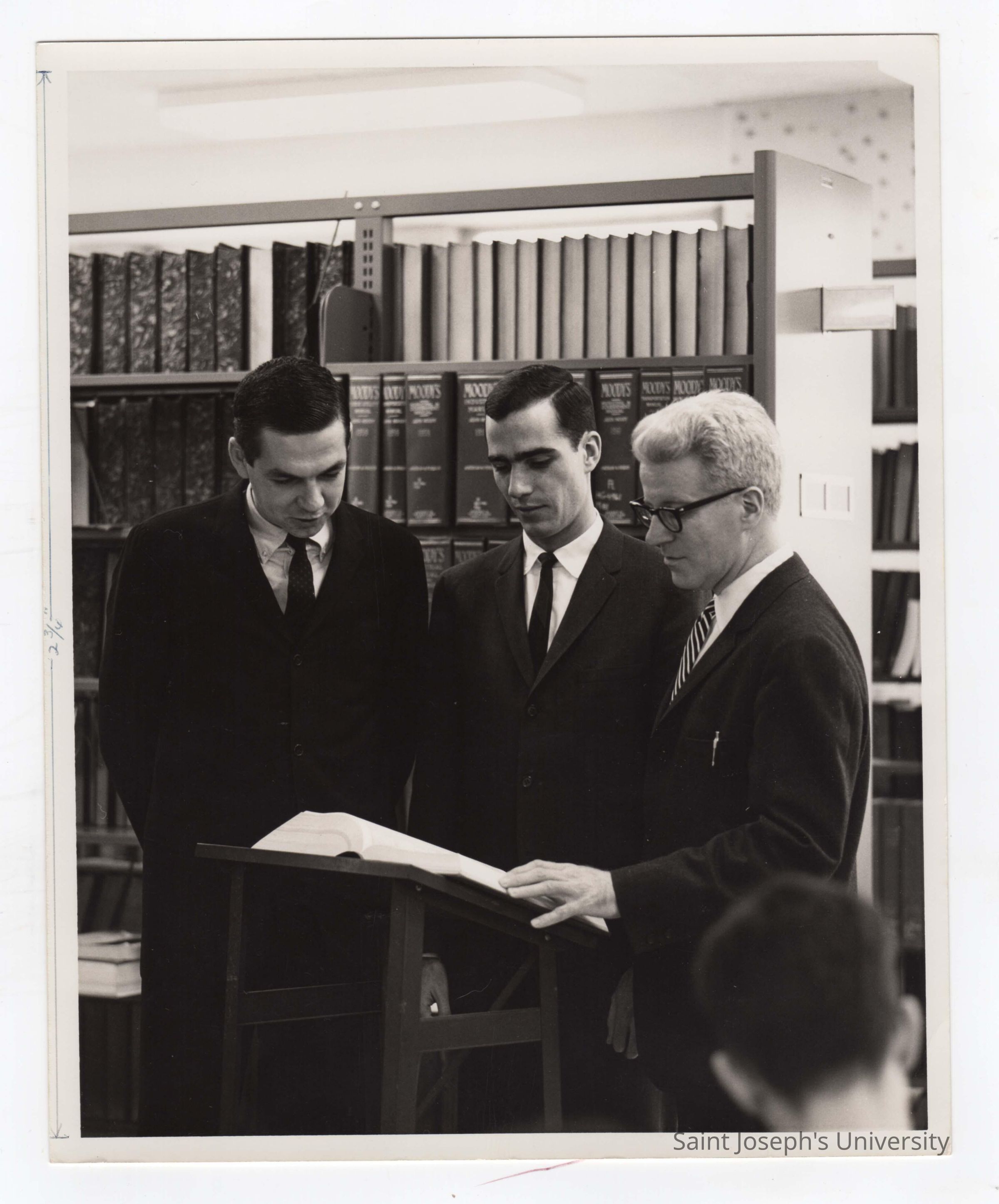 Business Administration Chair, Lawrence J. Bell, working with students in the Drexel Library, c. 1965.