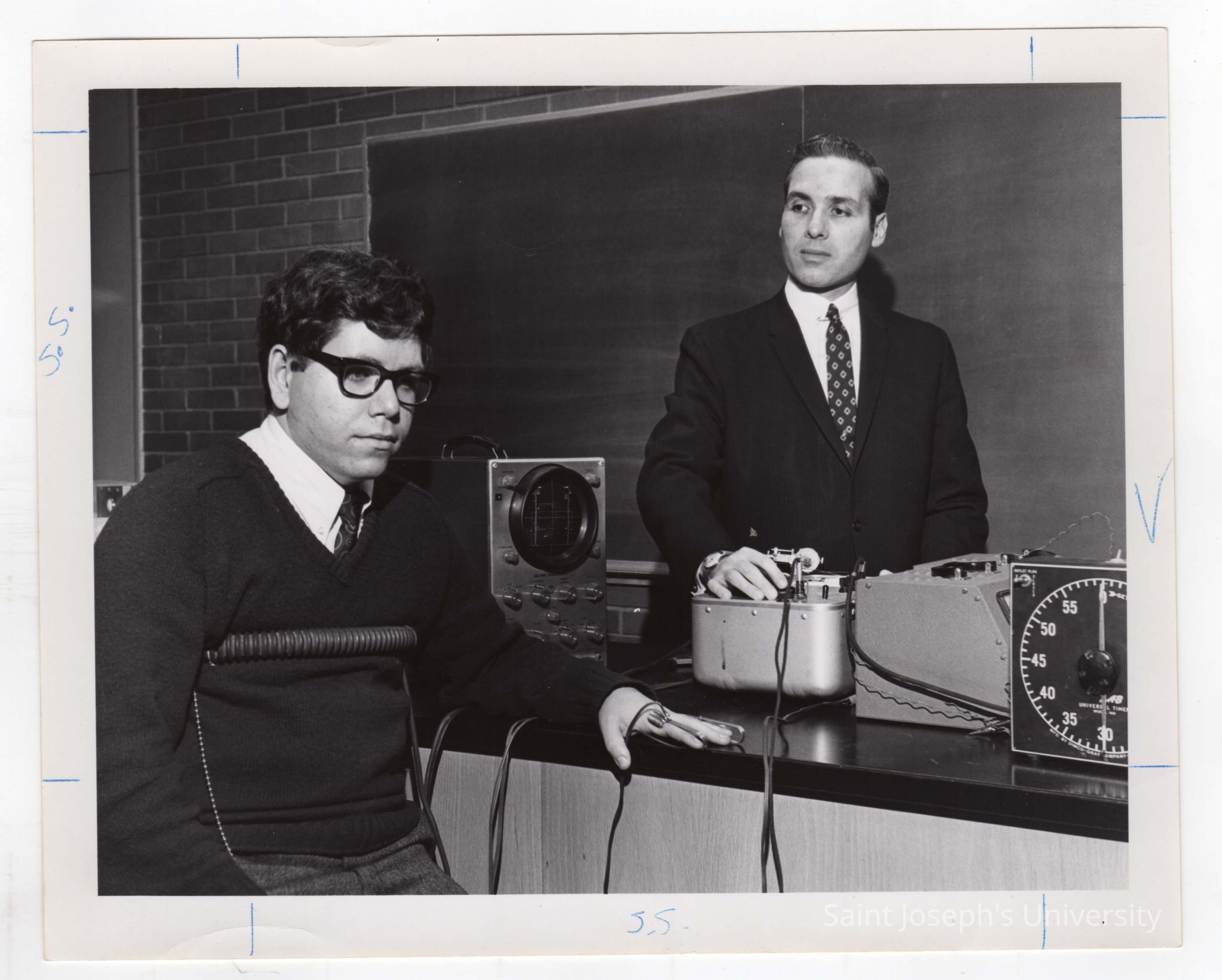 Psycholgy professor, I. Ralph Hyatt, with student demonstrating how the lie detector machine works, March 1968.