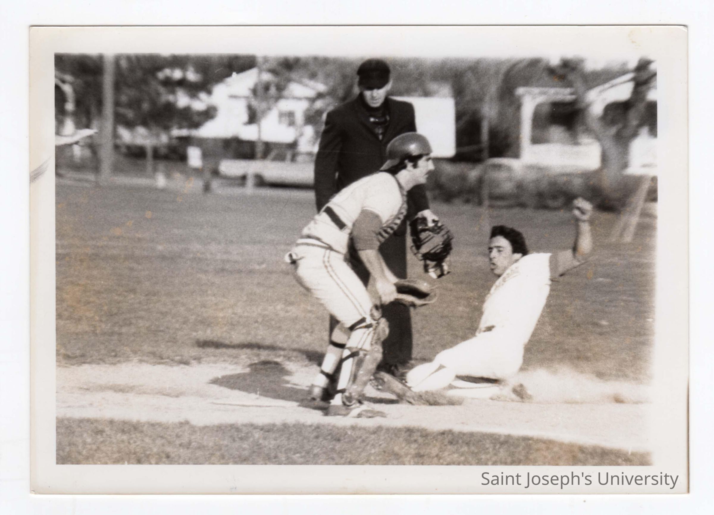 Men's baseball team playing in a game on SJC campus? Player is sliding into home plate.