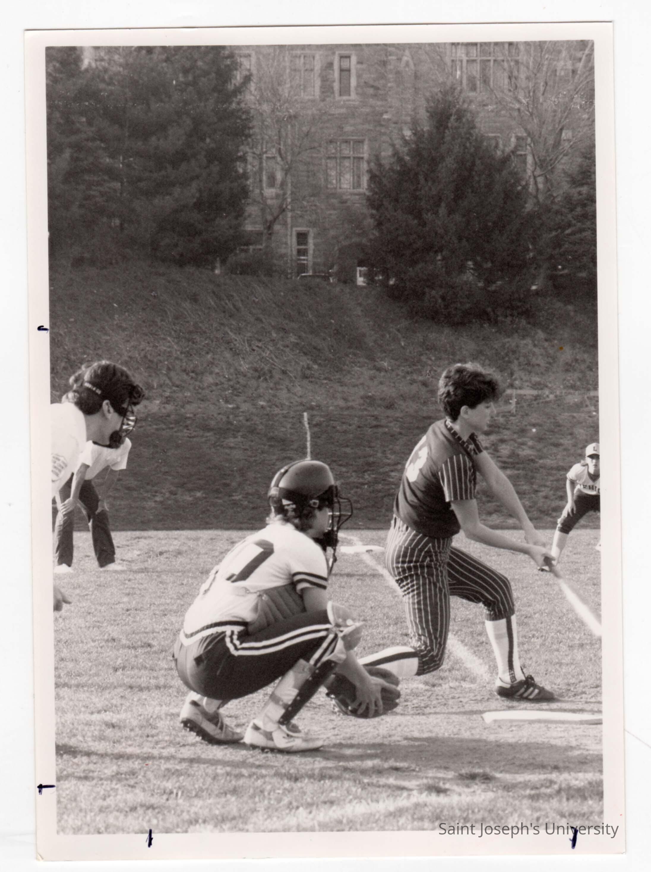 Women's softball game against Lehigh University with Barbelin Hall in background.