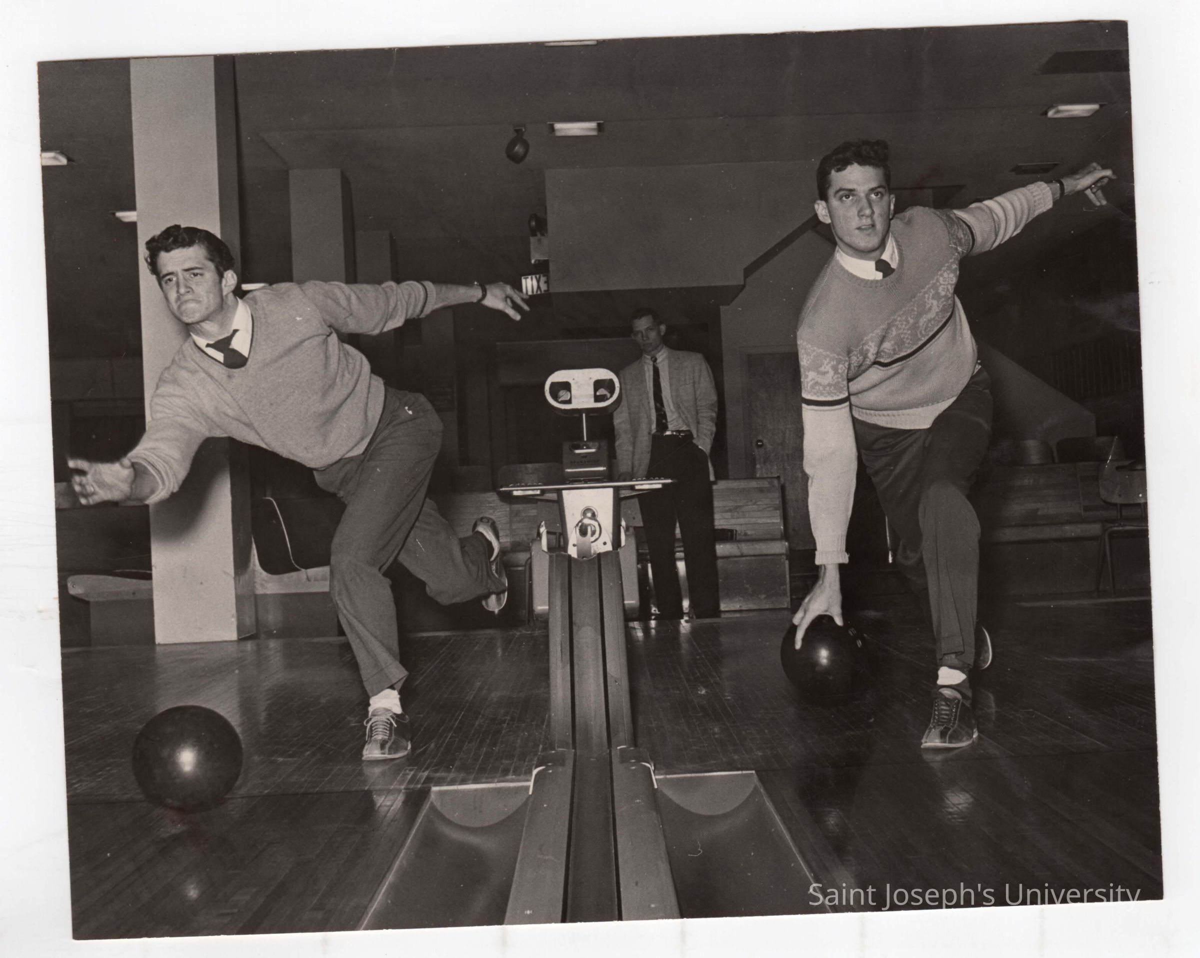 Two students bowling wearing sweaters, shirts, and ties as part of intramurals?