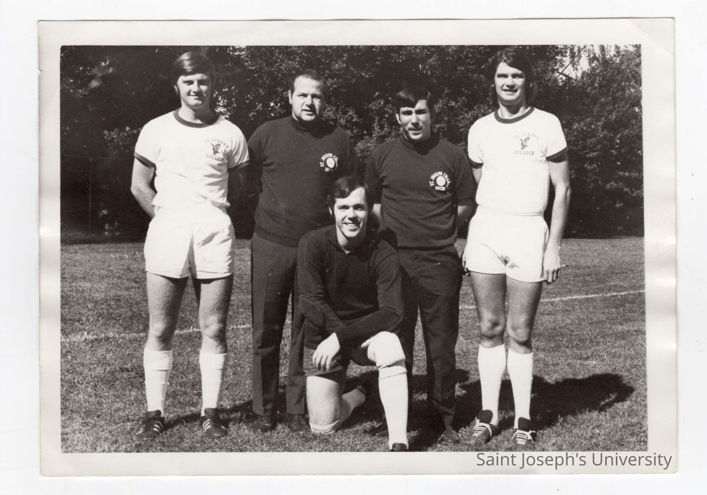 Men's soccer team members with Coaches Jack Ruggeri and Ed Blaney, 1974.