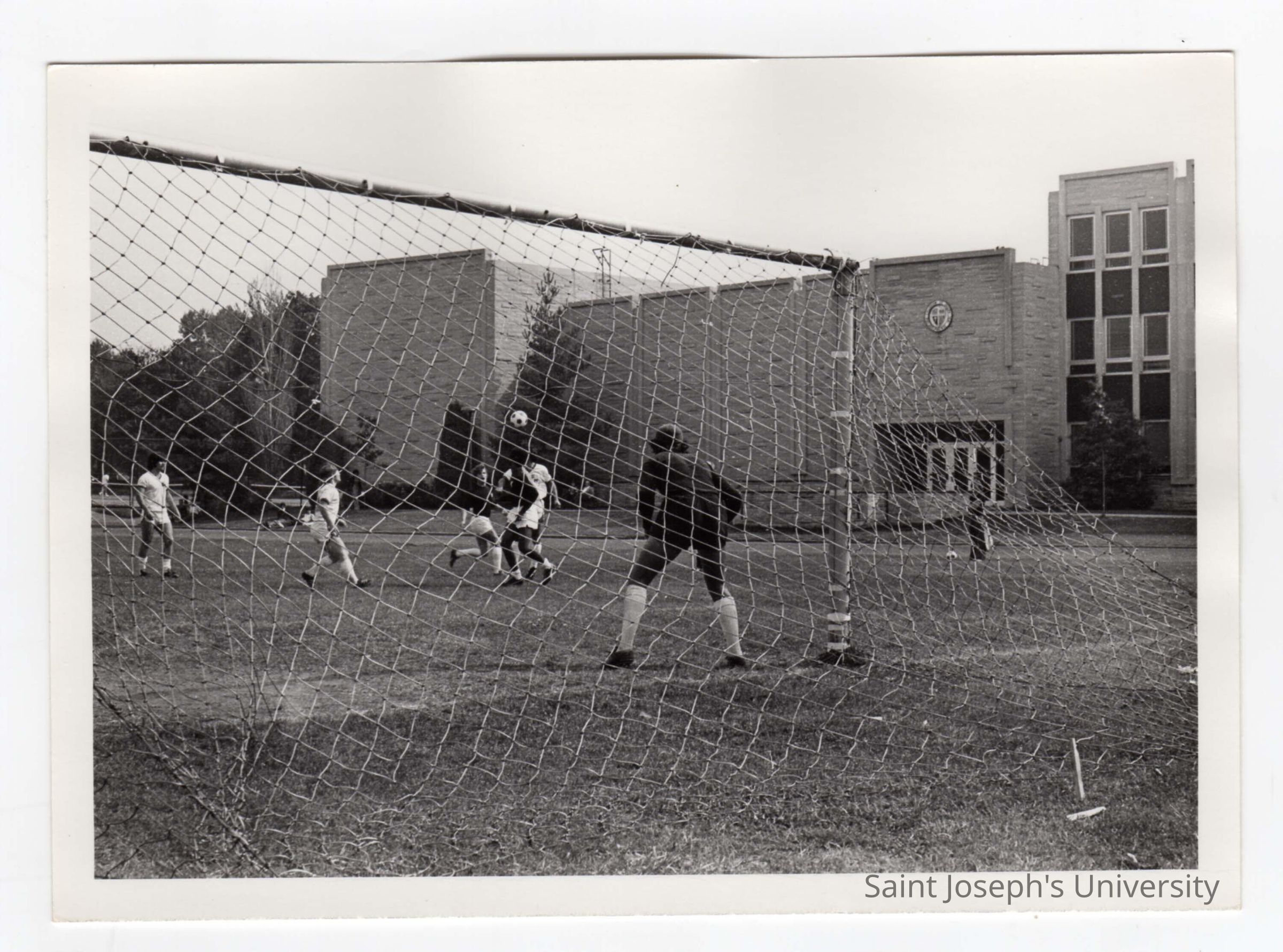 Men's soccer match with Post Hall in background.