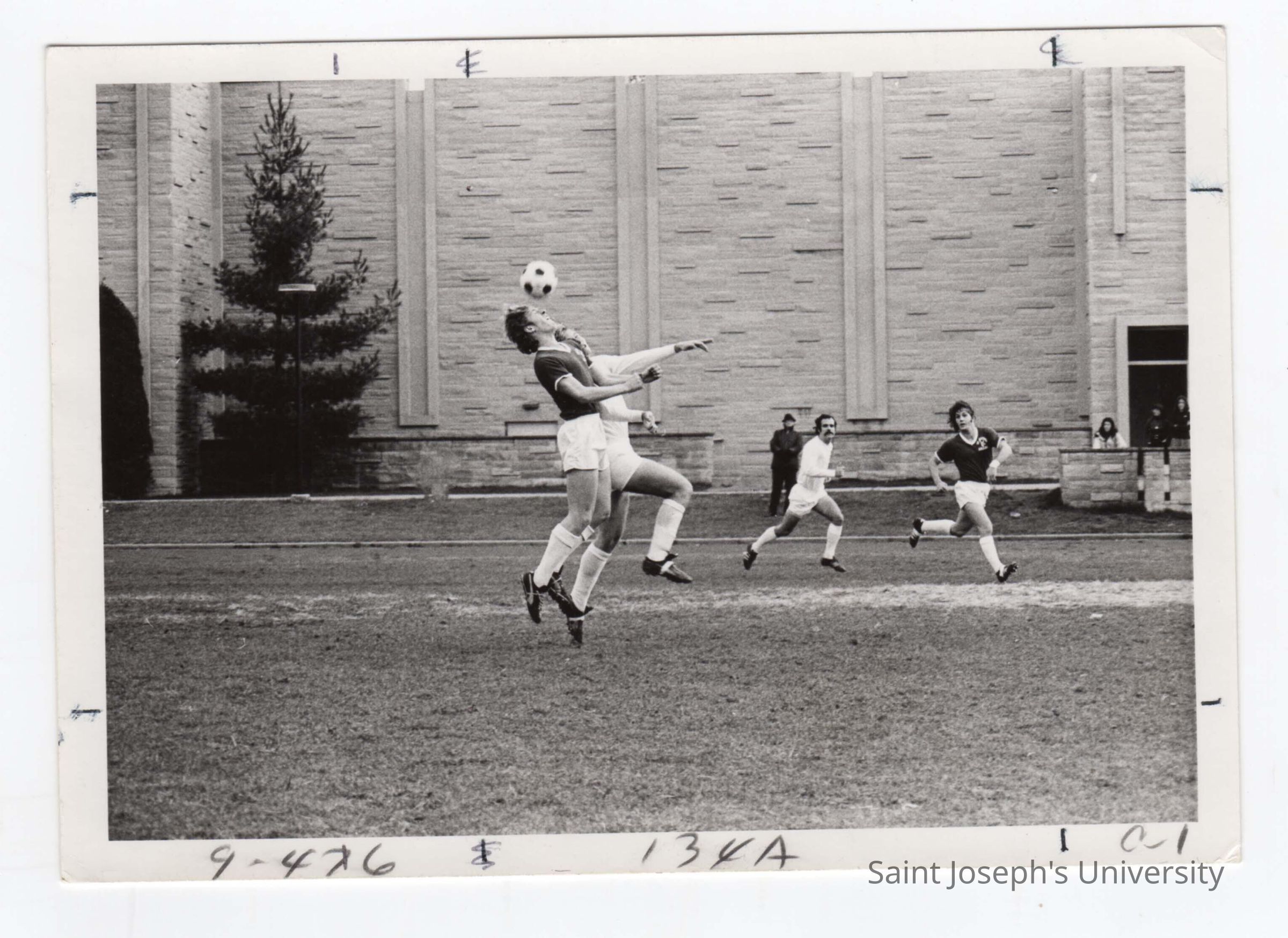 Men's soccer match on Finnesey Field with Post Hall (formerly Villiger) in background.