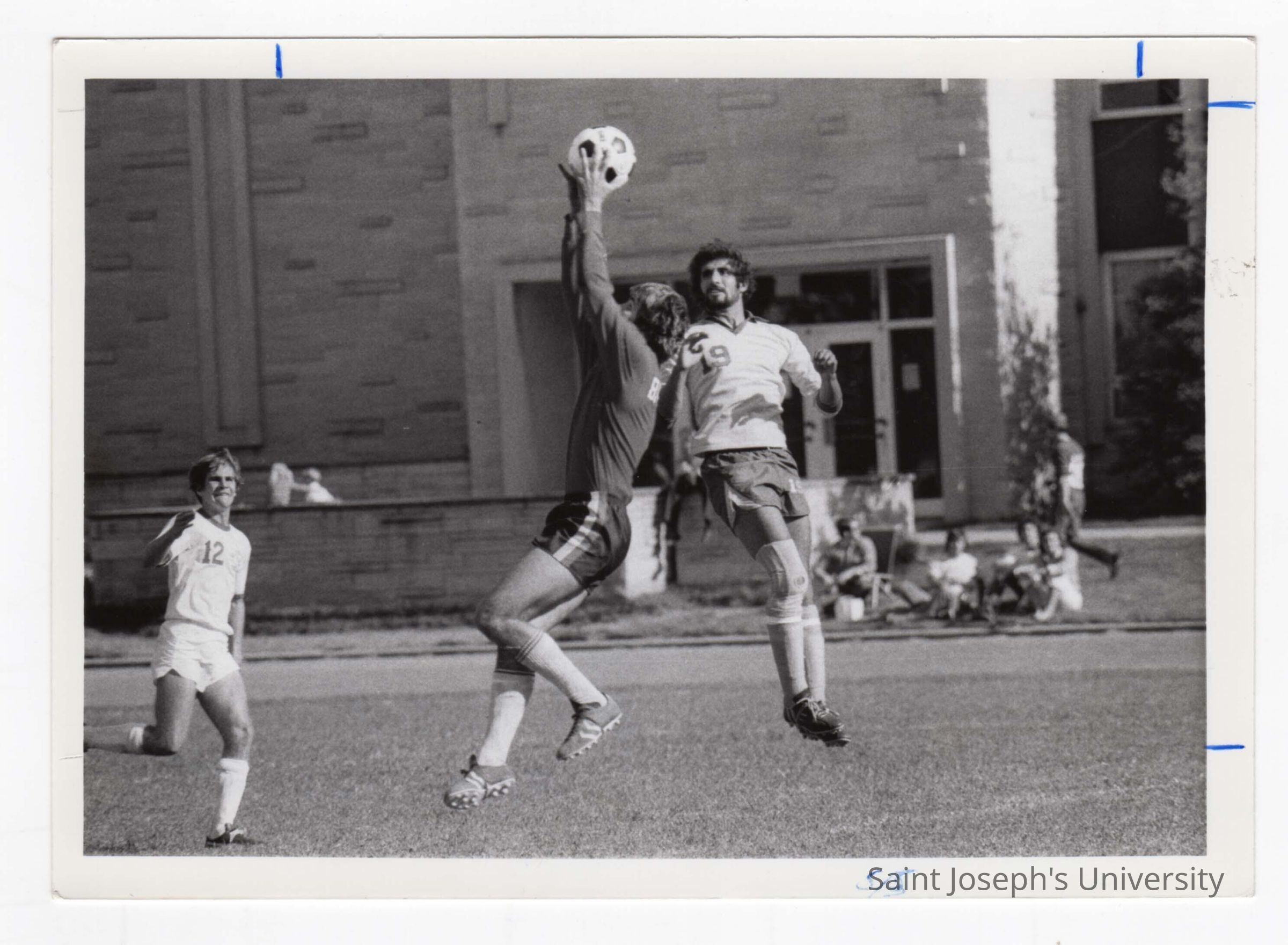 Men's soccer match on Finnesey Field with Post Hall (formerly Villiger) in background.
