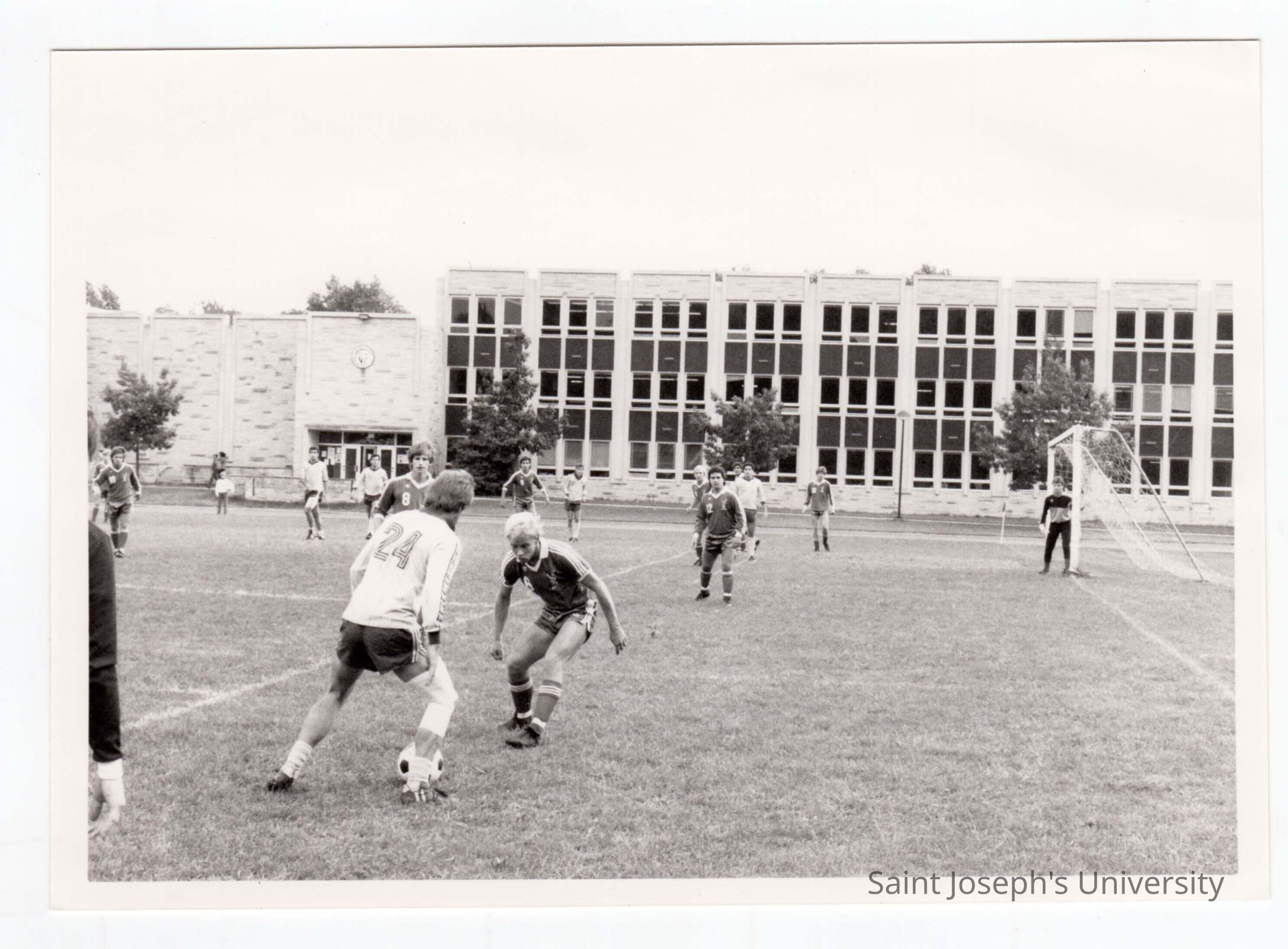 Men's soccer match on Finnesey Field with Post Hall (formerly Villiger) in background.
