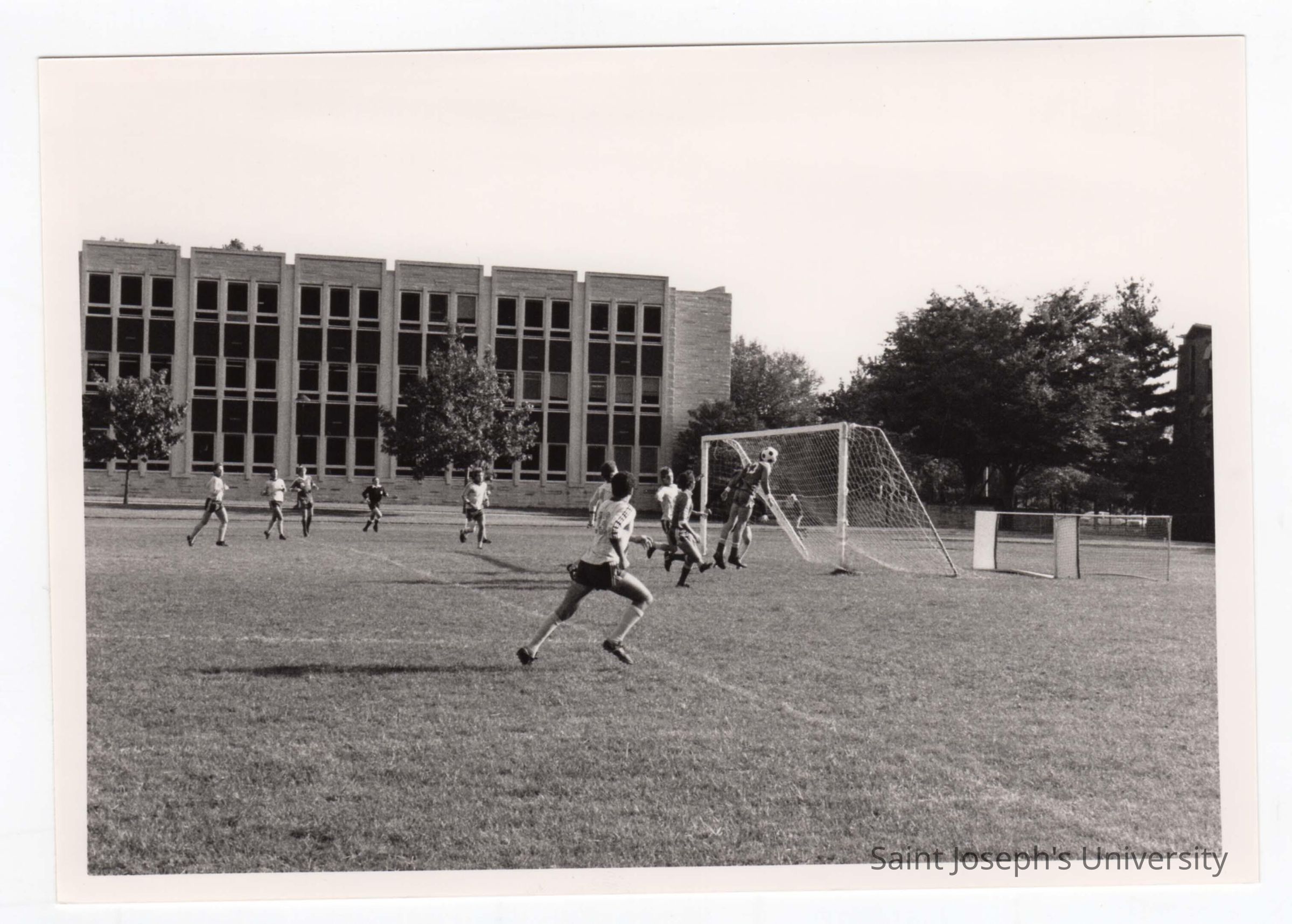 Men's soccer match on Finnesey Field with Post Hall (formerly Villiger) in background.