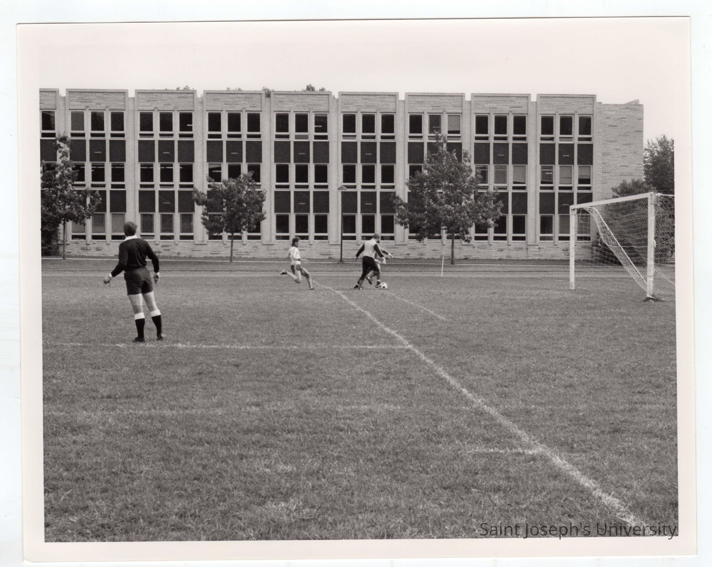 Men's soccer match with Post Hall (formerly Villiger) in background.