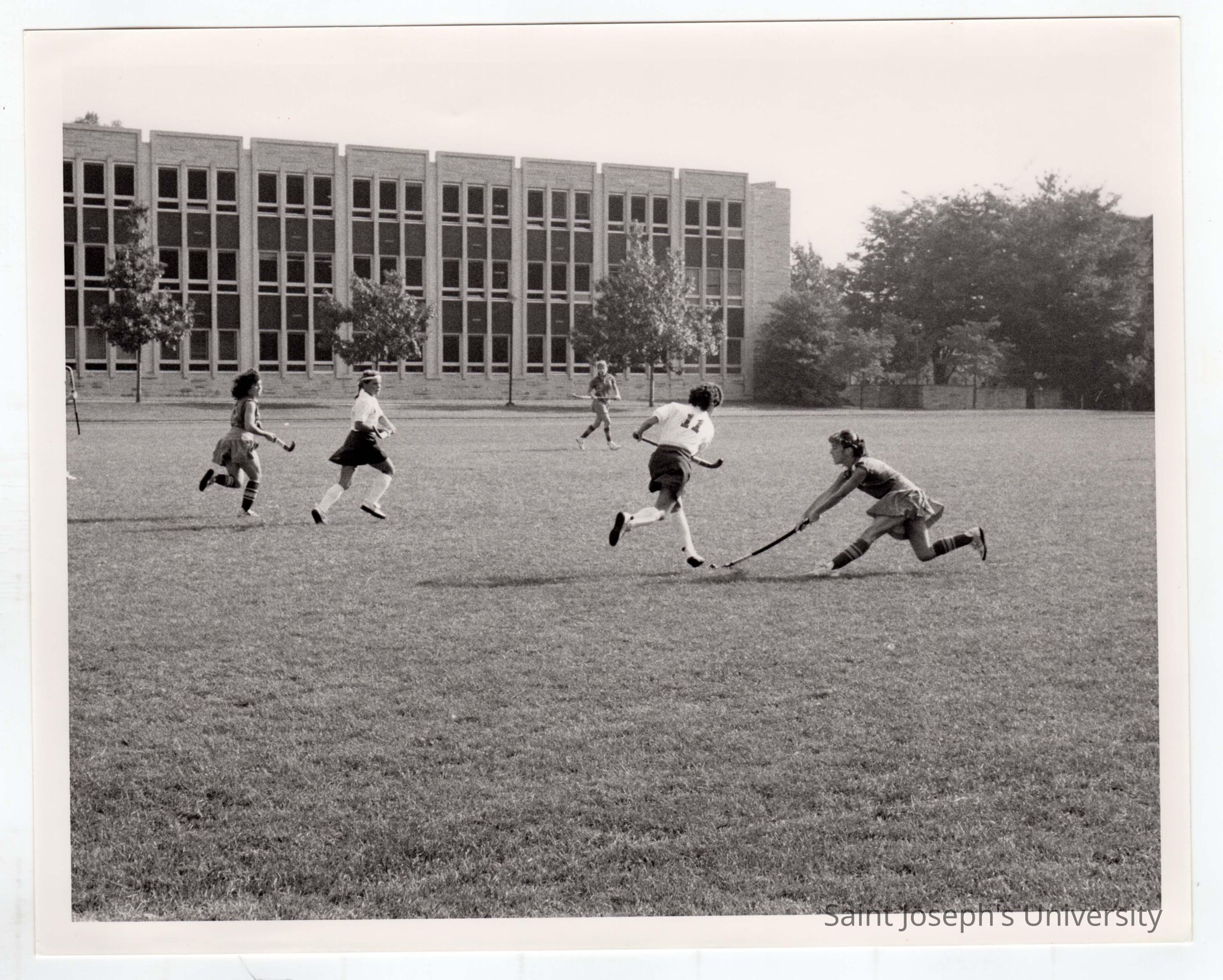 Women's field hockey match on Finnesey Field with Post Hall (formerly Villiger) in background.
