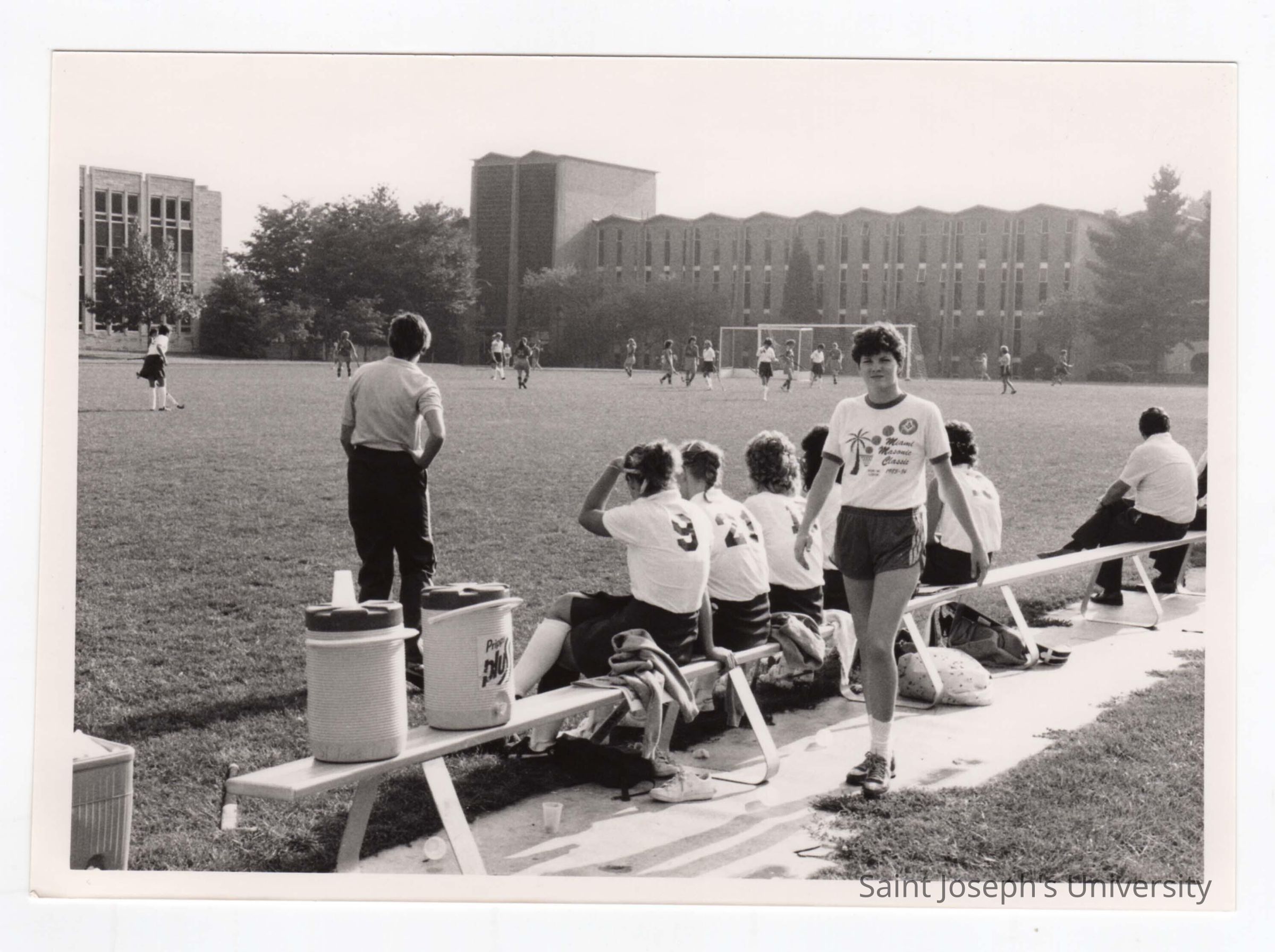 Women's field hockey match on Finnesey Field with Bellarmine in background.